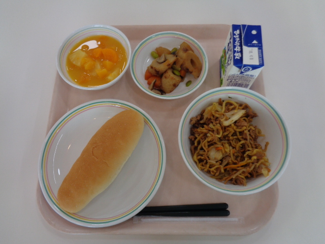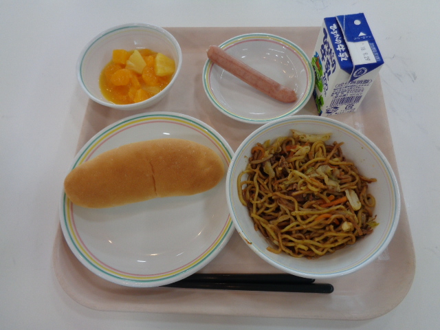 給食では、中華めんをオーブンで焼いています。それは、釜で炒めると、炒めているうちに釜にくっついて、仕上げる頃には量が少なくなってしまったり、切れ切れの麺になってしまう可能性があるためです。オーブンでしっかりと焼くことで、温度がきちんと上がり、材料と釜で混ぜ合わせる時間が少なくなり、釜にくっつくことも少なくなるためです。また、給食ではケチャップを使っています。今日のやきそばのお味はいかがですか?