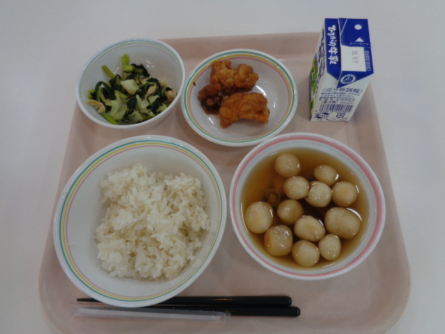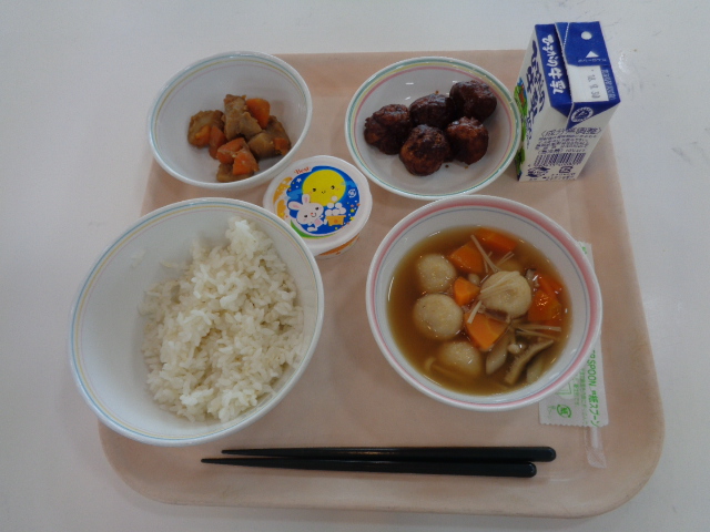 今年のお月見は9月24日です。お月見には、月見だんごが供えられます。穀物の収穫に感謝し、米を粉にして、月に見たてて丸めて作ったのが月見だんごのはじまりです。月と同じく丸いだんごをお供えし、それを食べることで、健康と幸せが得られるとされています。また、「十五夜」は、芋の収穫を祝う意味を込めて「芋名月」ともいい、里芋料理の「きぬかつぎ」なども供えます。また、今日の汁は「だまこ汁」です。秋田県の郷土料理で、ごはんを丸くして、他の材料と一緒に煮たものです。今日のだまご汁に入っている玄米団子は、山県市でとれたお米を使っています。味わって食べてくださいね。