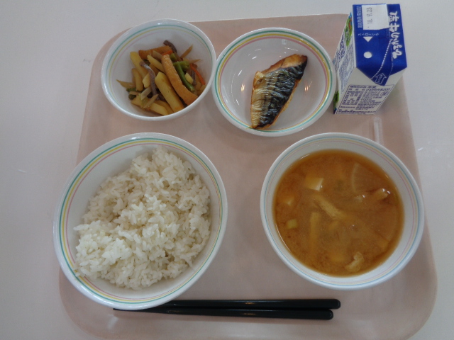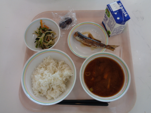 今日は、いわしの煮つけです。いわしは、調理室の釜でじっくりと軟らかくなるように煮込みました。しかし、骨は堅いので、そのまま かぶりつかず、骨を外して食べてください。片側の身の上側を はしで骨から外して食べ、下側の身を食べます。その後、骨を外し、下側の身を食べていきます。しっかりとよくかんで食べてください。口の中に骨がないことを確認してから飲み込んでください。