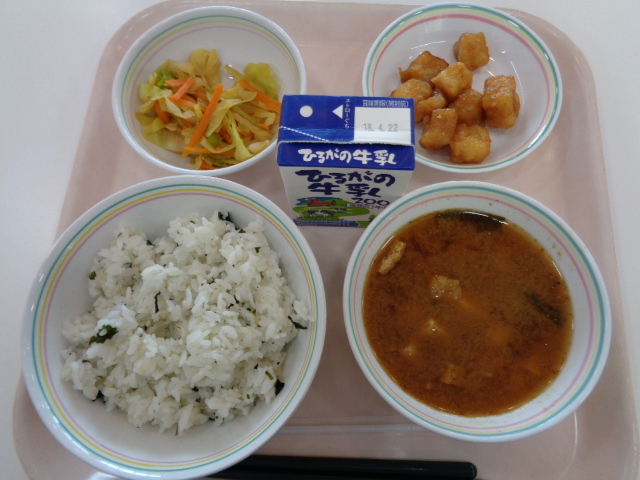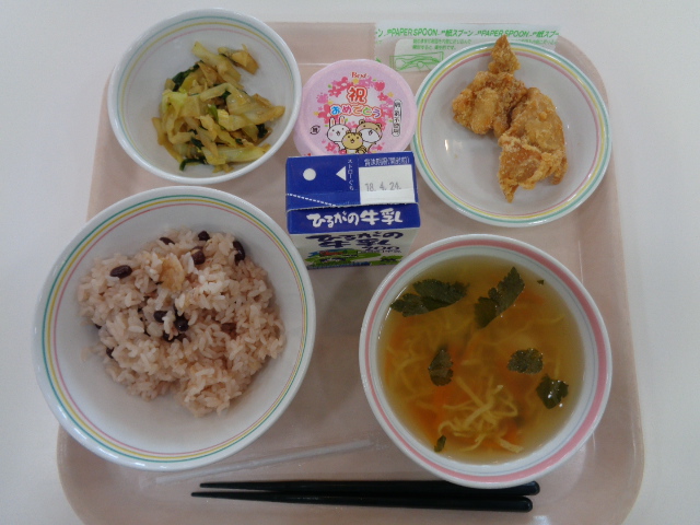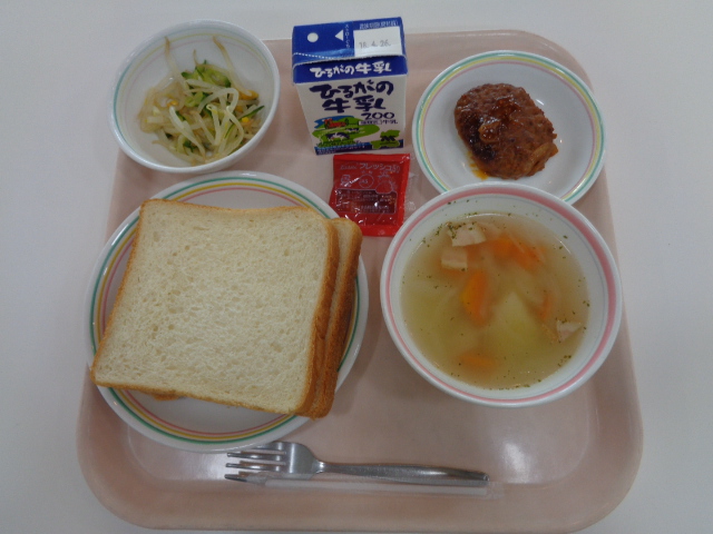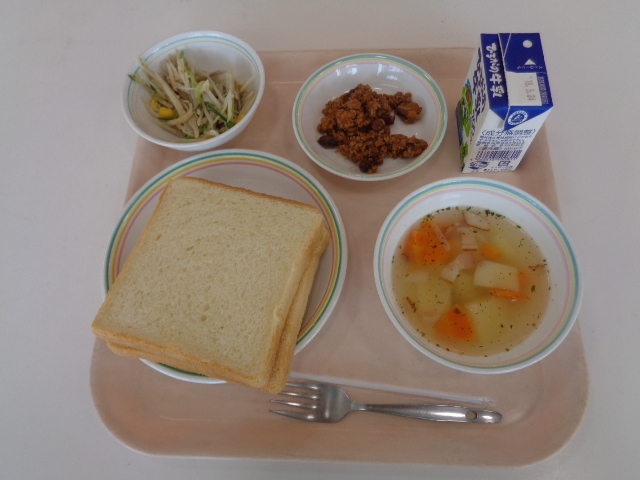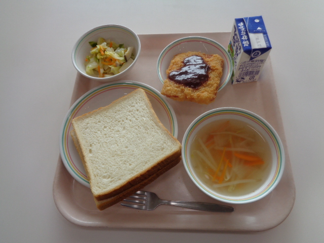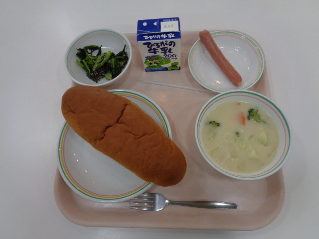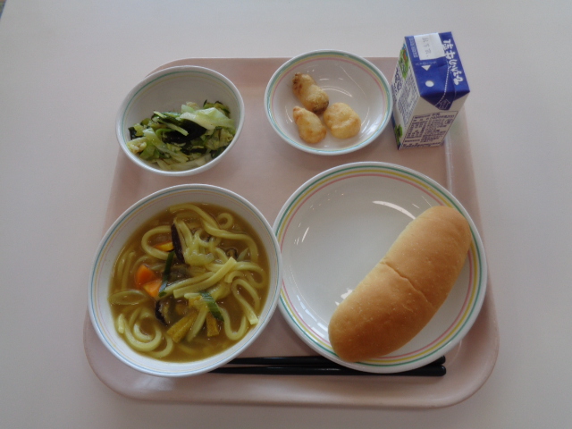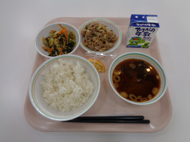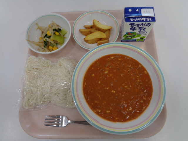 今日は、給食の麺料理の中でも人気のある焼きそばです、給食の焼きそばのおいしさの秘密は2つあります。①麺をオーブンでパリッと焼いていること。②隠し味としてケチャップを入れていることです。小型パンとの組み合わせで、パサパサして食べにくいときは、牛乳を飲みながら食べましょう。また、デザートのフルーツポンチは、シロップの代わりにオレンジジュースを使っています。フルーツだけでなくシロップも飲みきってくださいね。