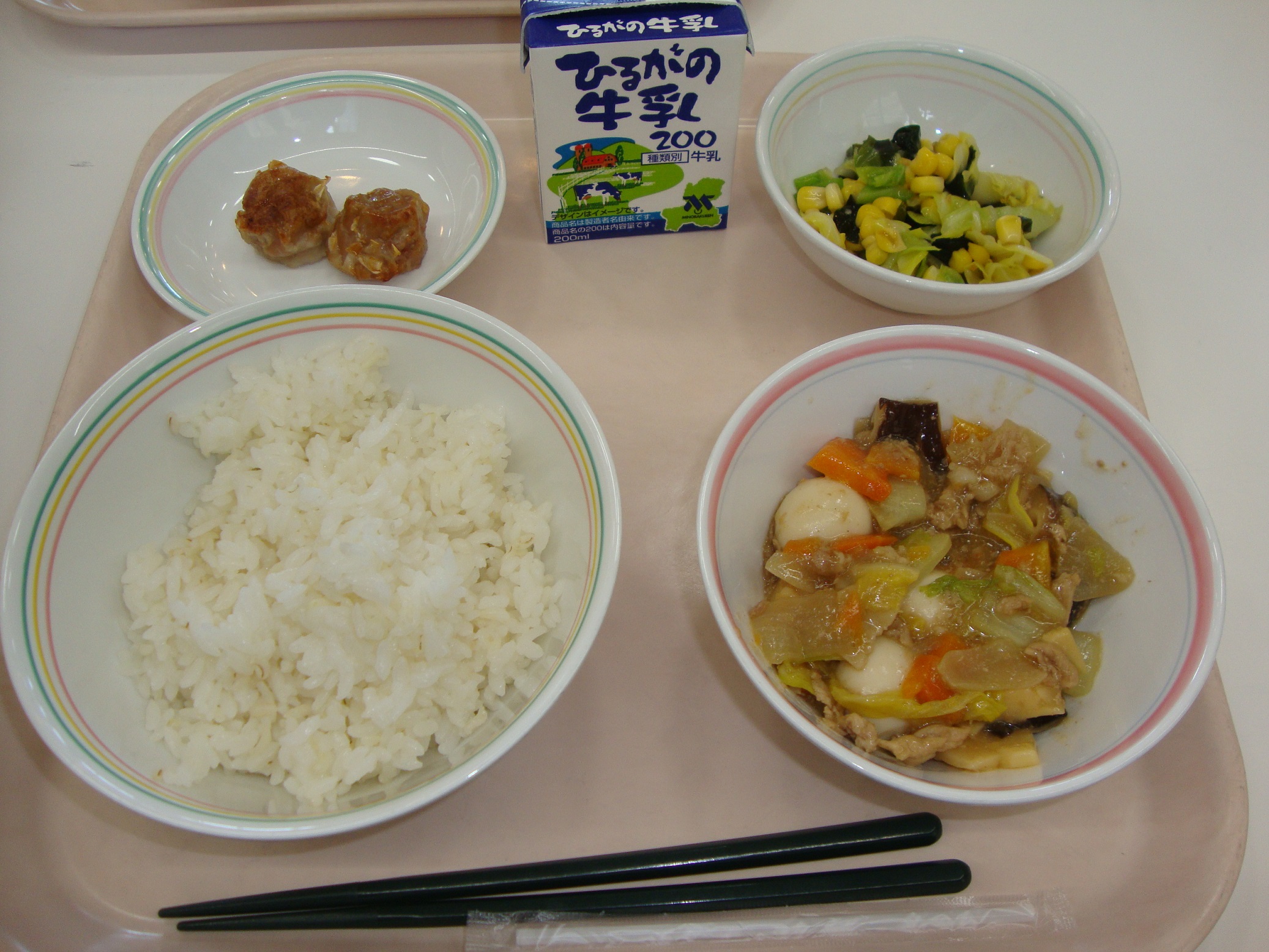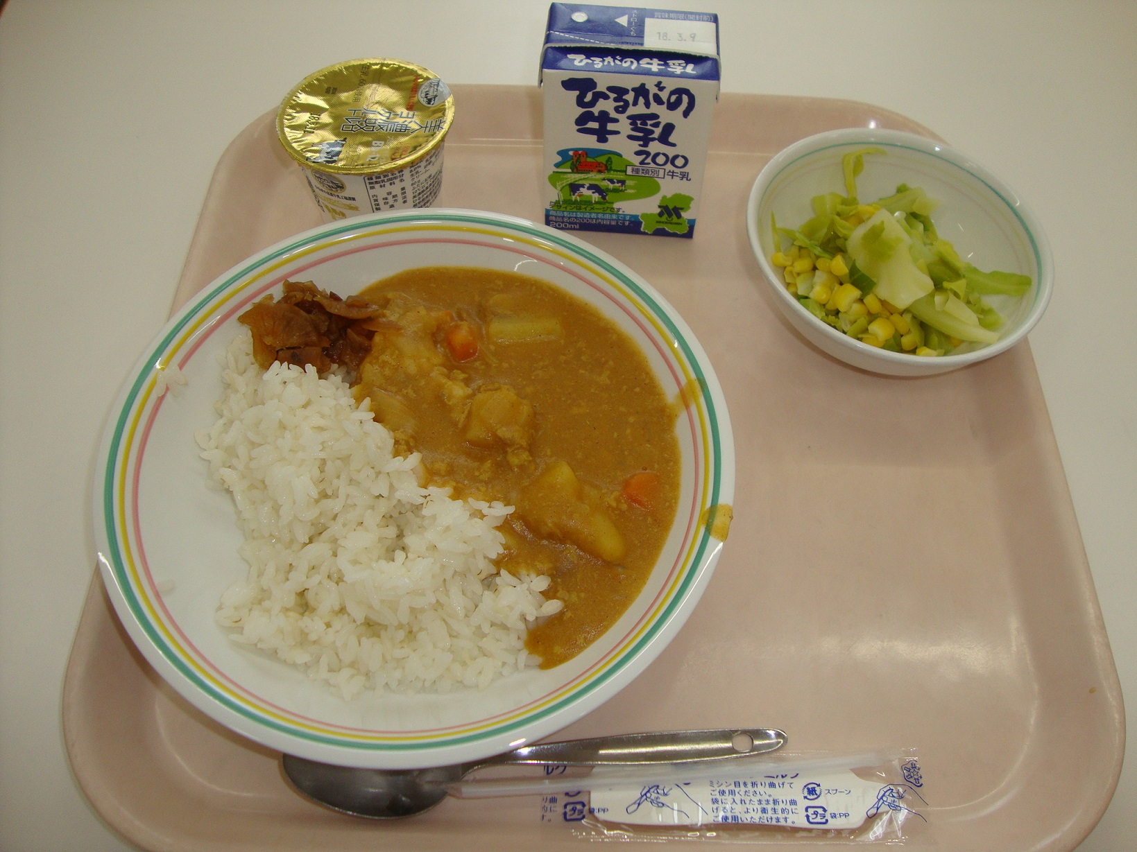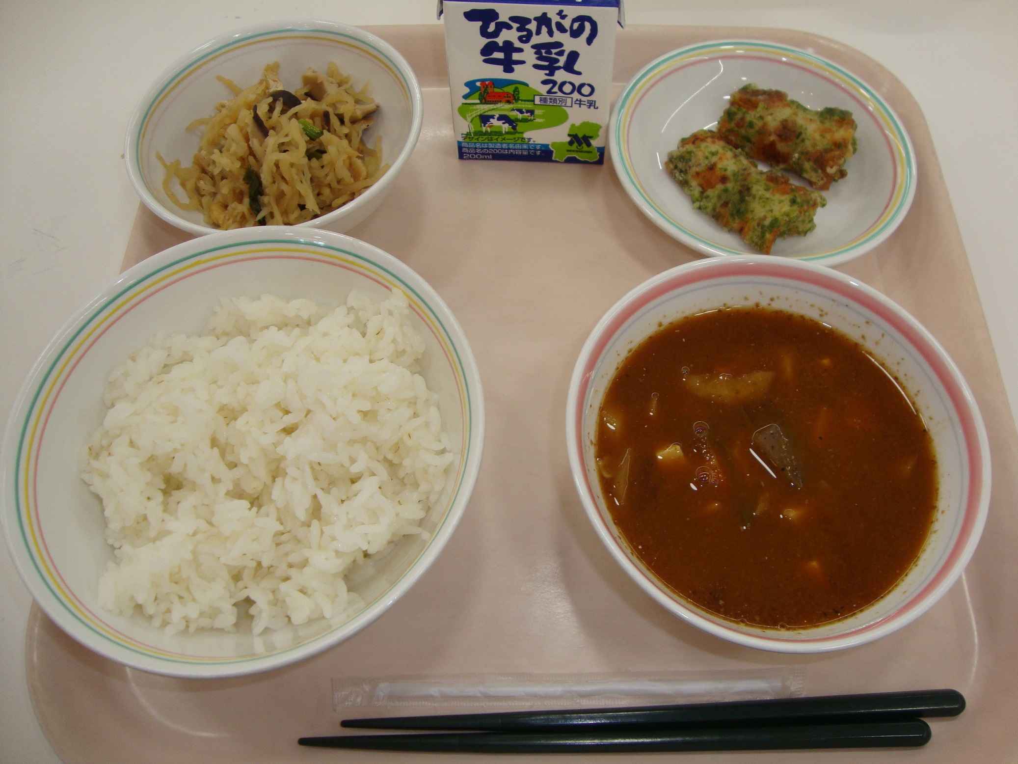 入学、進級でまだ緊張している人も多いと思います。そんなみなさんが食べやすいように、今日は人気メニュー「カレーライス」の給食です。