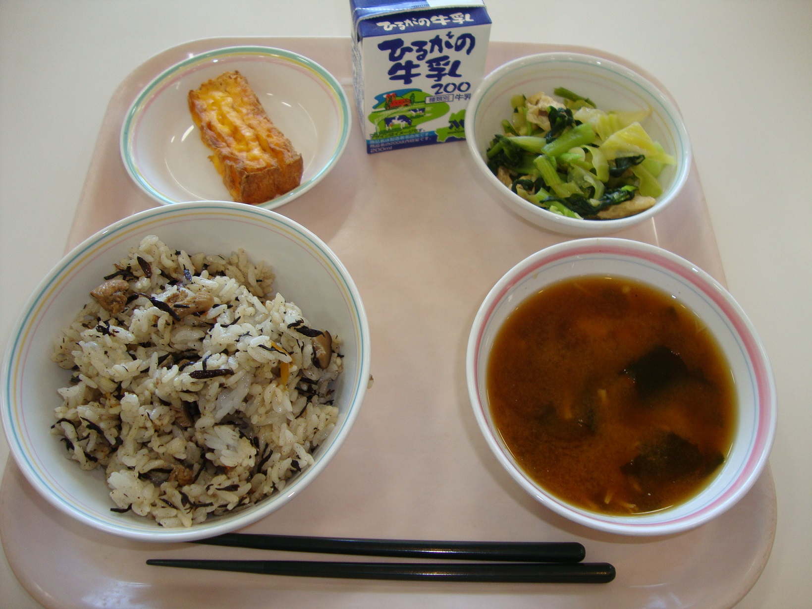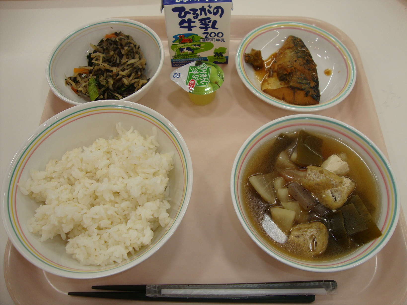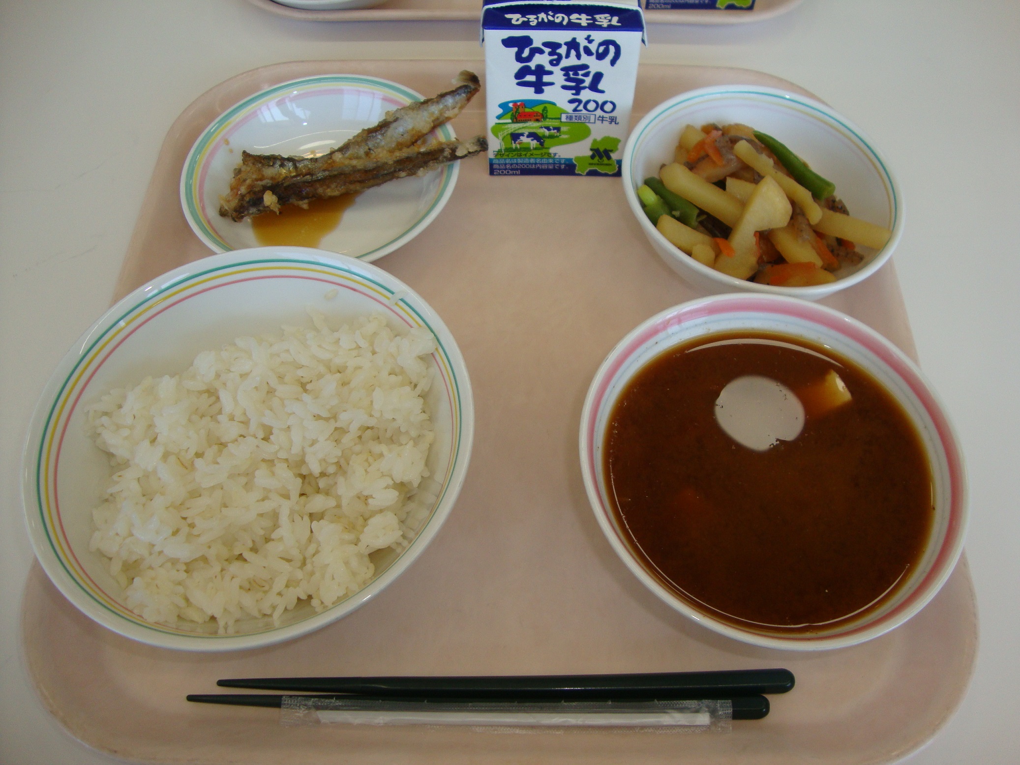 今日は、「大豆とじゃこの揚げがらめ」です。じゃこは丸ごと食べることができるので、カルシウムがたくさんです。また、大豆にもカルシウムが多く含まれています。大豆はカリッとするまでしっかりと油で揚げてあるため、よくかんで食べますね。よくかむことはとても大切なことです。食べ物を食べる時に、食べにくいからと牛乳などで流し込む人がいますが、しっかりとよくかむことを心がけてくださいね。