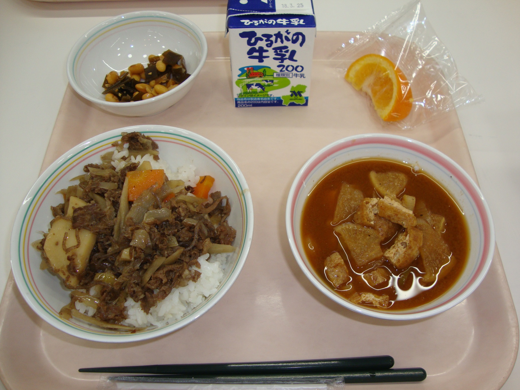 大豆は給食ではほぼ毎月登場します。3月には「だいずとじゃこの揚げがらめ」で登場しましたね。では、みなさんは、お家では大豆を食べていますか?家では出されても食べないとか、豆の料理は家では登場しないという人もきっといるでしょうね。給食で大豆が登場するのは、だいずが「畑の肉」といわれるぐらい、体にとても良いはたらきをしてくれる食べ物だからです。乾燥させた豆は、水にもどすと2倍ぐらいに大きく膨らみ、そのまま土に埋めると、芽が出てくるくらい、強い食べ物です。ぜひ、給食以外でも食べてほしいですね。