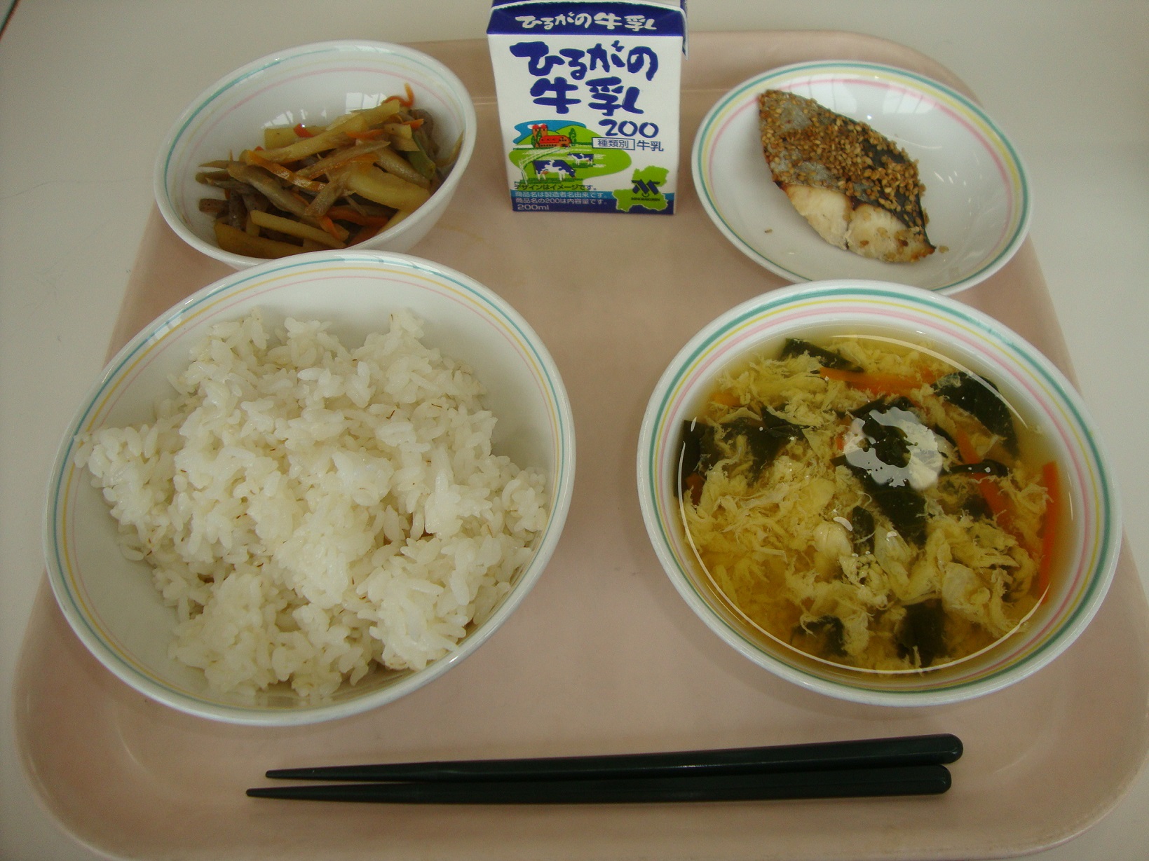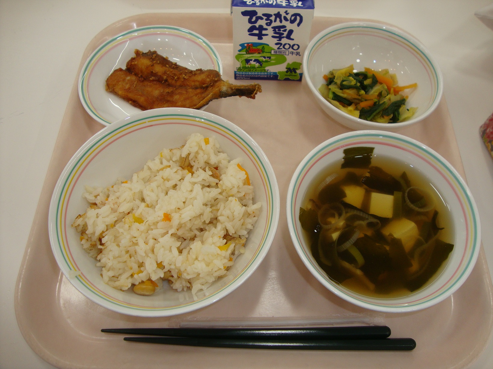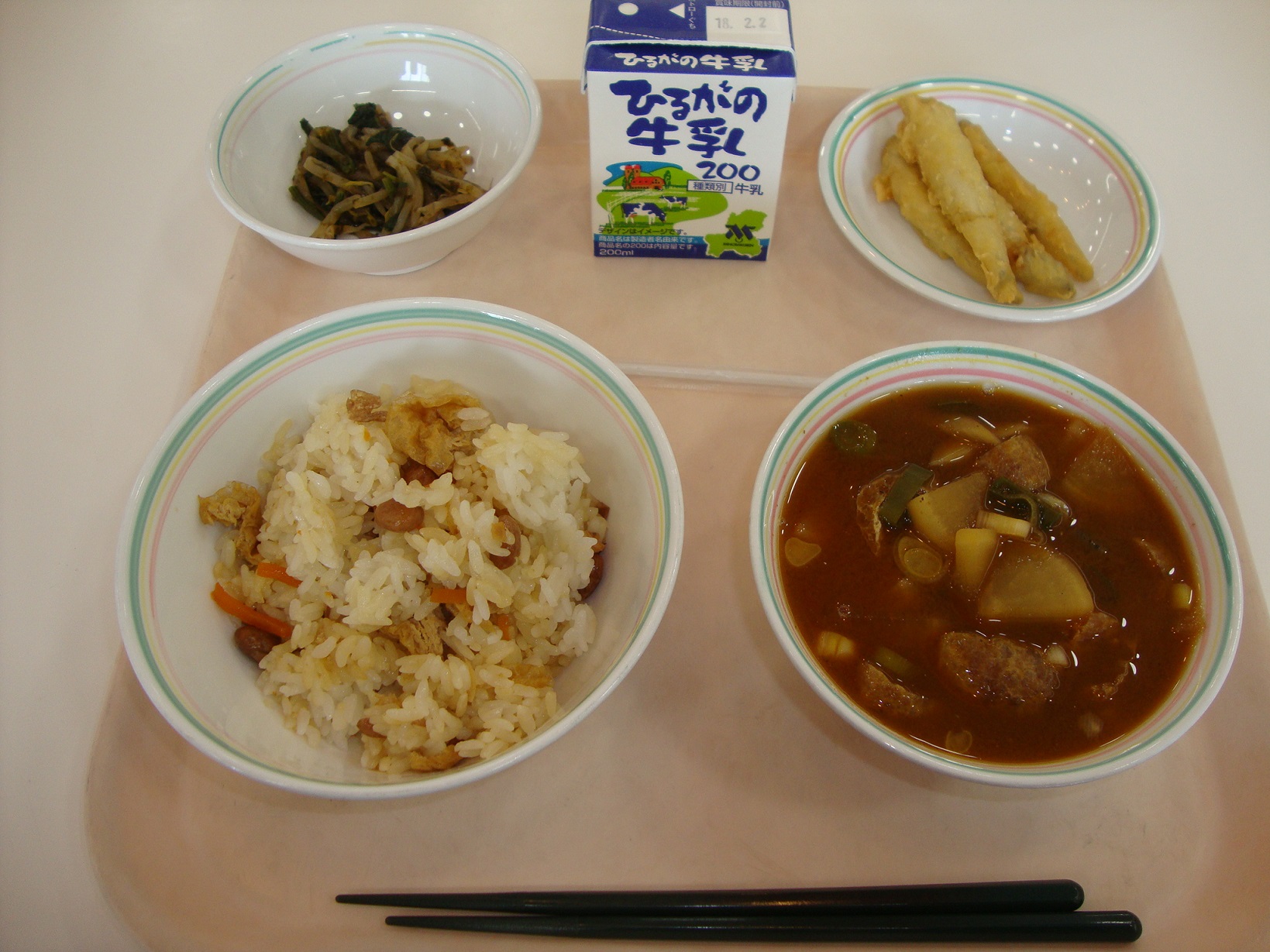今日から1週間は、全国学校給食週間です。全国の学校で様々な取り組みがされていますが、山県市では、岐阜県の郷土料理や市内でとれた食材をたくさん使った献立を予定しています。今日は、山県市の特産である桑の木豆を使った 具だくさんの混ぜごはんの献立です。桑の木豆だけでなく、伊自良でとれたもち米も入っているので、いつものごはんよりもモチモチしていると思います。主菜のわかさぎは、今日の給食では市内でとれたものを使うことができませんでしたが、山県市の伊自良湖に生息しており、冬のわかさぎ釣りが有名ですね。ほうれん草や大根も市内でたくさん作られている野菜です。山県市の恵みに感謝しながら食べてくださいね。
