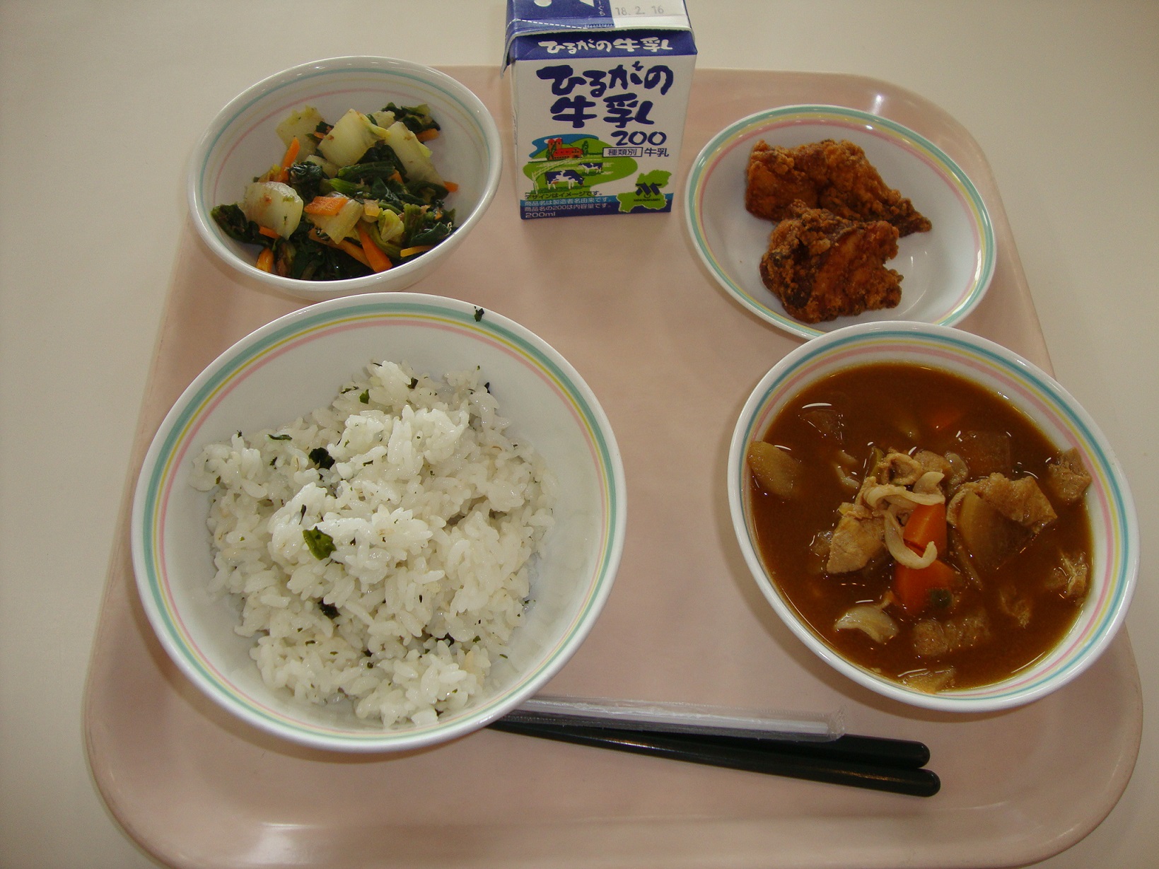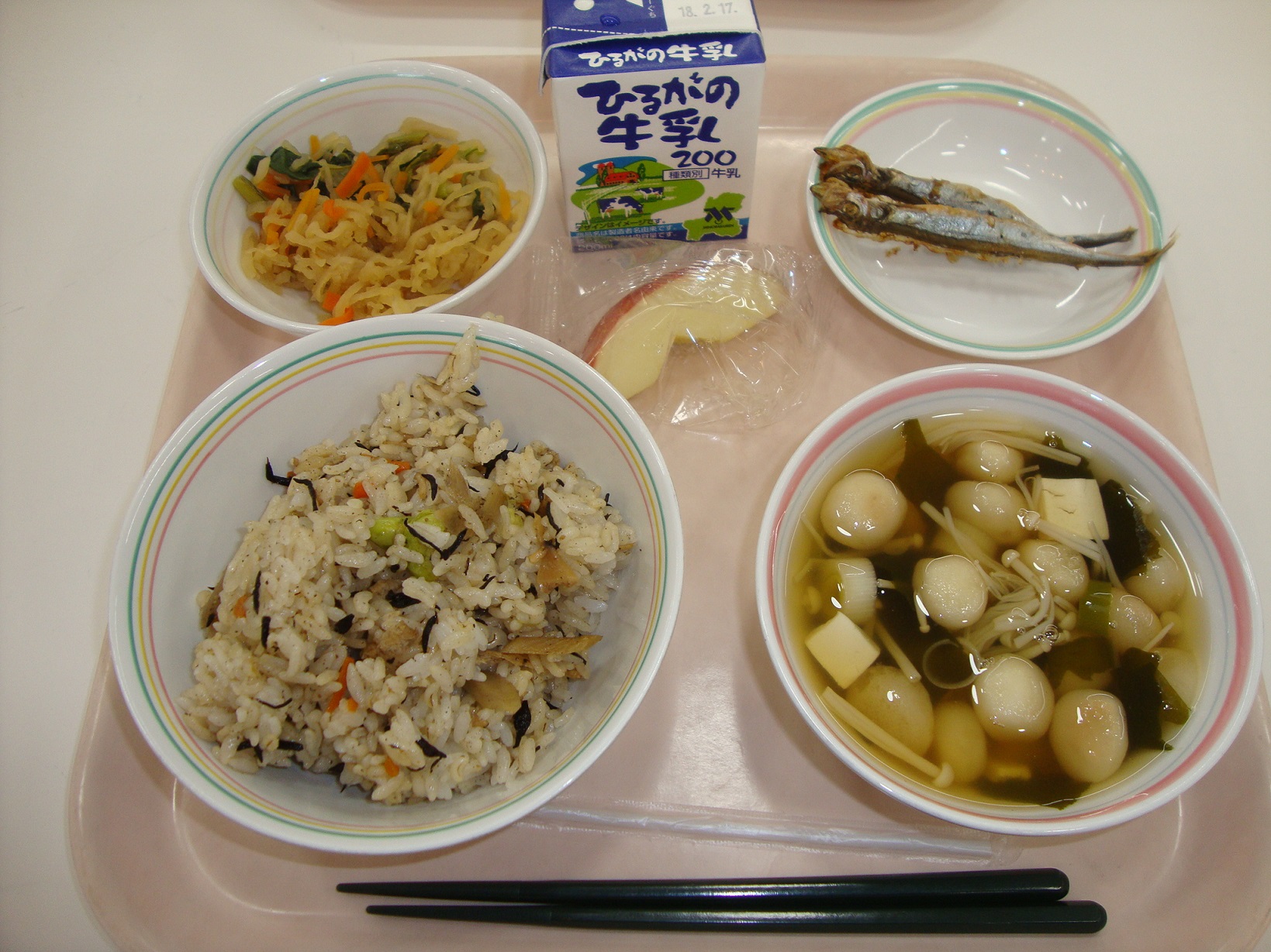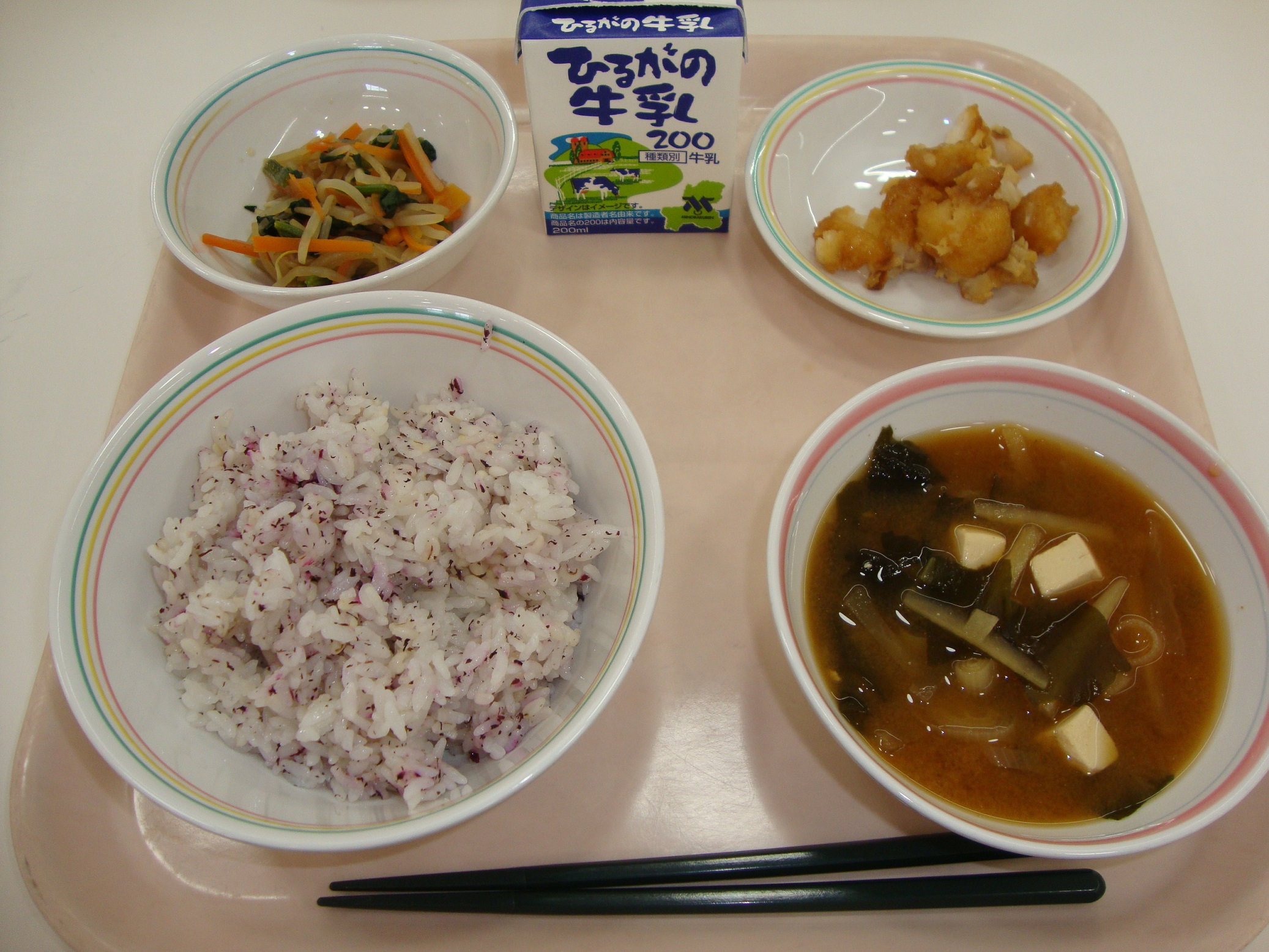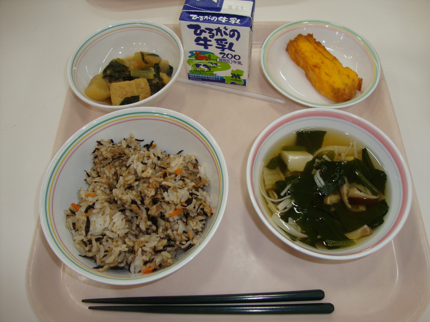 今日から1週間は、全国学校給食週間です。全国の学校で様々な取り組みがされていますが、山県市では、岐阜県の郷土料理や市内でとれた食材をたくさん使った献立を予定しています。今日は、山県市の特産である桑の木豆を使った 具だくさんの混ぜごはんの献立です。桑の木豆だけでなく、伊自良でとれたもち米も入っているので、いつものごはんよりもモチモチしていると思います。主菜のわかさぎは、今日の給食では市内でとれたものを使うことができませんでしたが、山県市の伊自良湖に生息しており、冬のわかさぎ釣りが有名ですね。ほうれん草や大根も市内でたくさん作られている野菜です。山県市の恵みに感謝しながら食べてくださいね。
