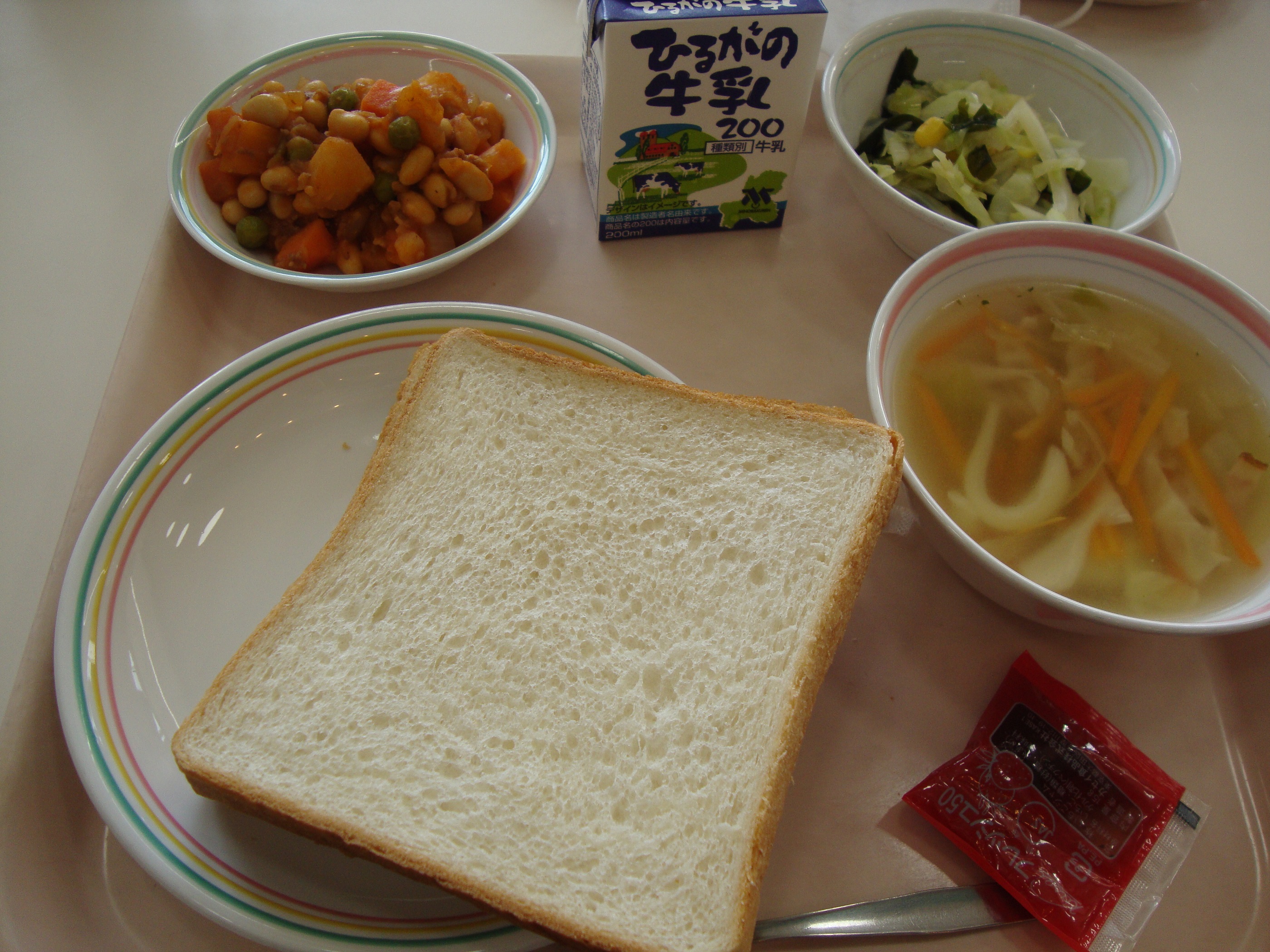今日のポークビーンズには、大豆が入っています。学校給食では、地元伊自良や岐阜県内でとれた大豆を使っています。