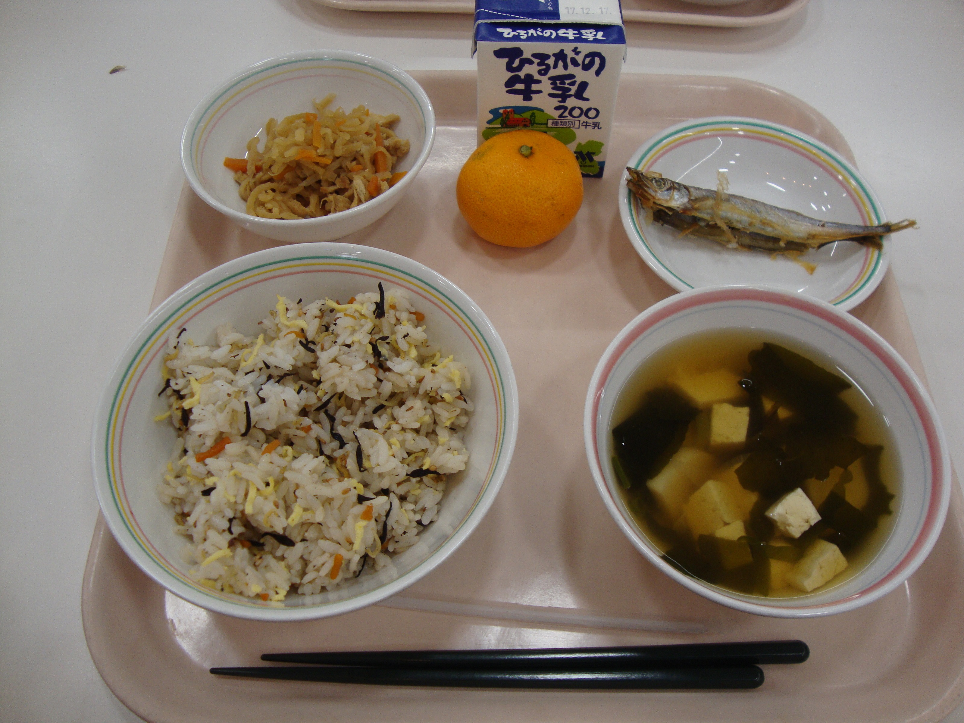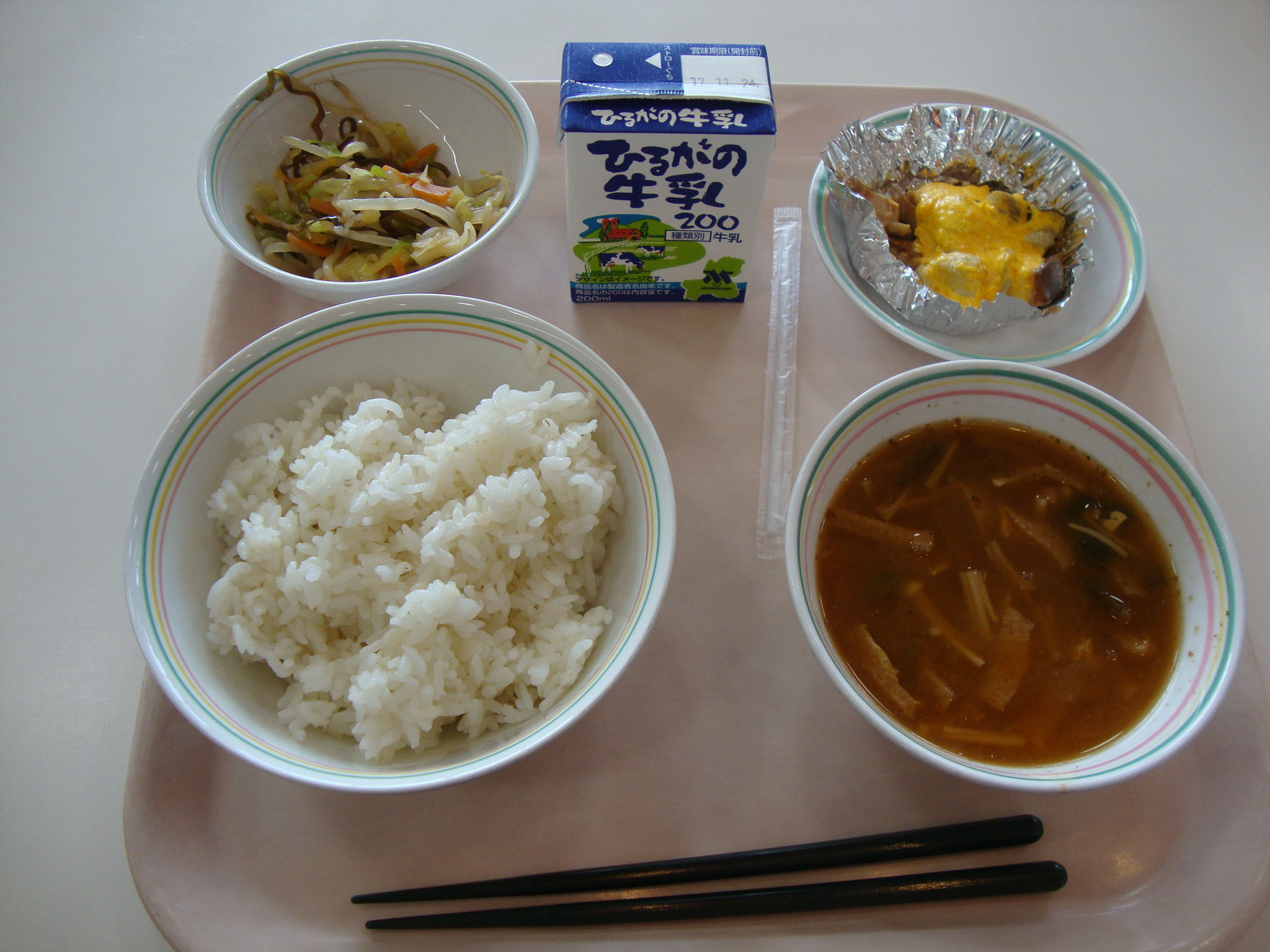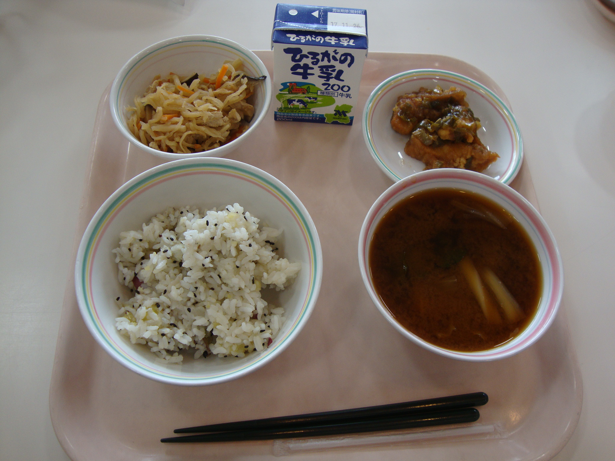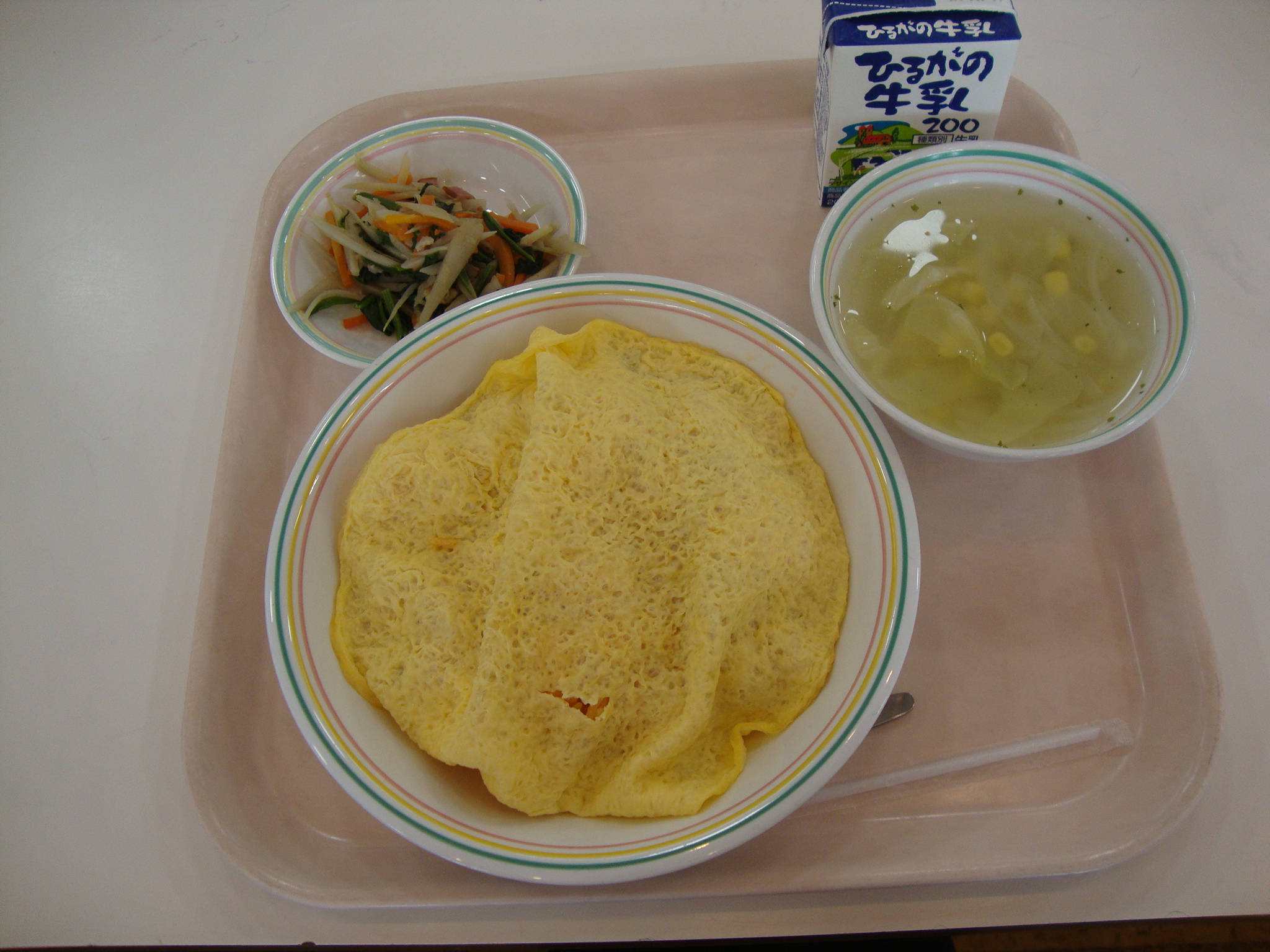 ごぼうは、外国で食べることは ほとんどありません。昔、日本で外国の人にごぼうの料理を出したところ、「木の根っこを食べさせた。」と言って問題になったほどです。そのため、今日のような「ごぼうのソテー」は、外国には存在しない料理です。ごぼうには、体の中を掃除する食物繊維や、体に良い働きをするポリフェノールも含まれています。よくかんで、ごぼうのおいしさを味わってください。また、今日はオムライスです。ケチャップ味のチキンライスに卵のシートをのせました。オムライスは、外国の料理ではなく、日本の料理です。味わって食べてくださいね。