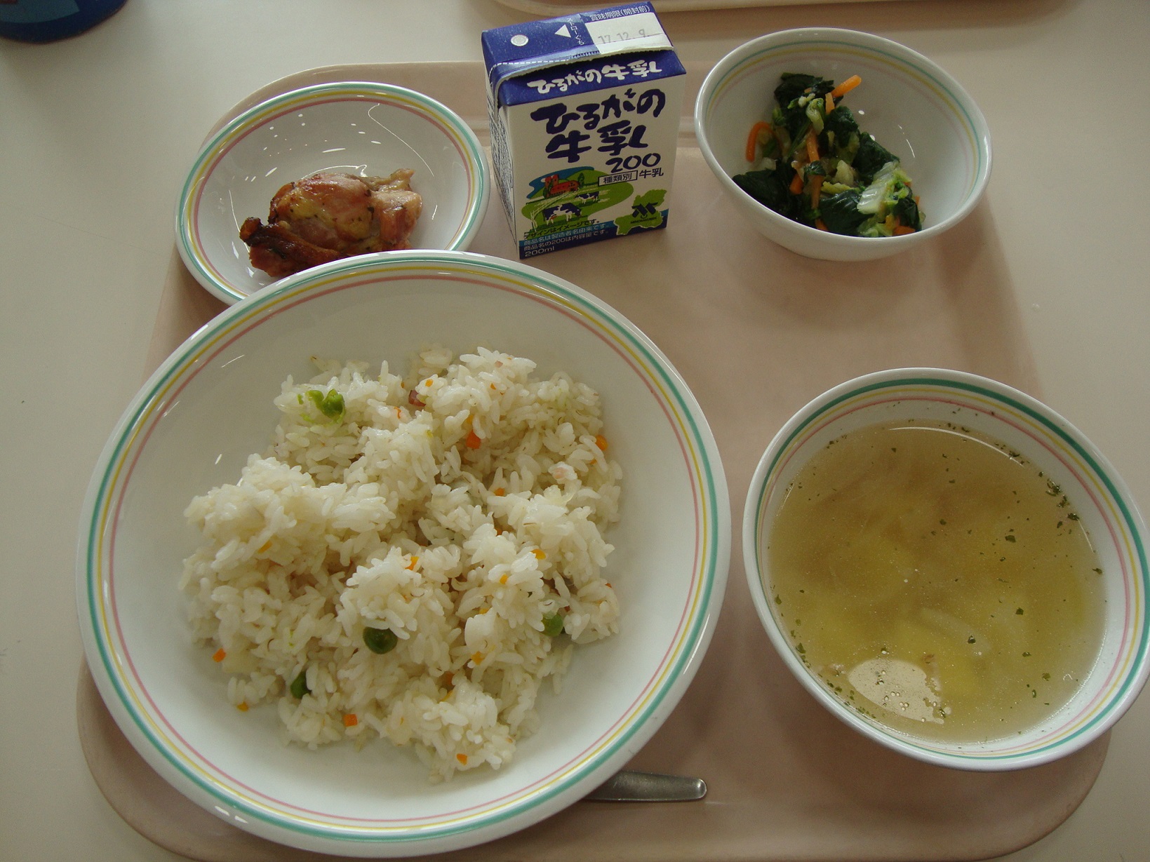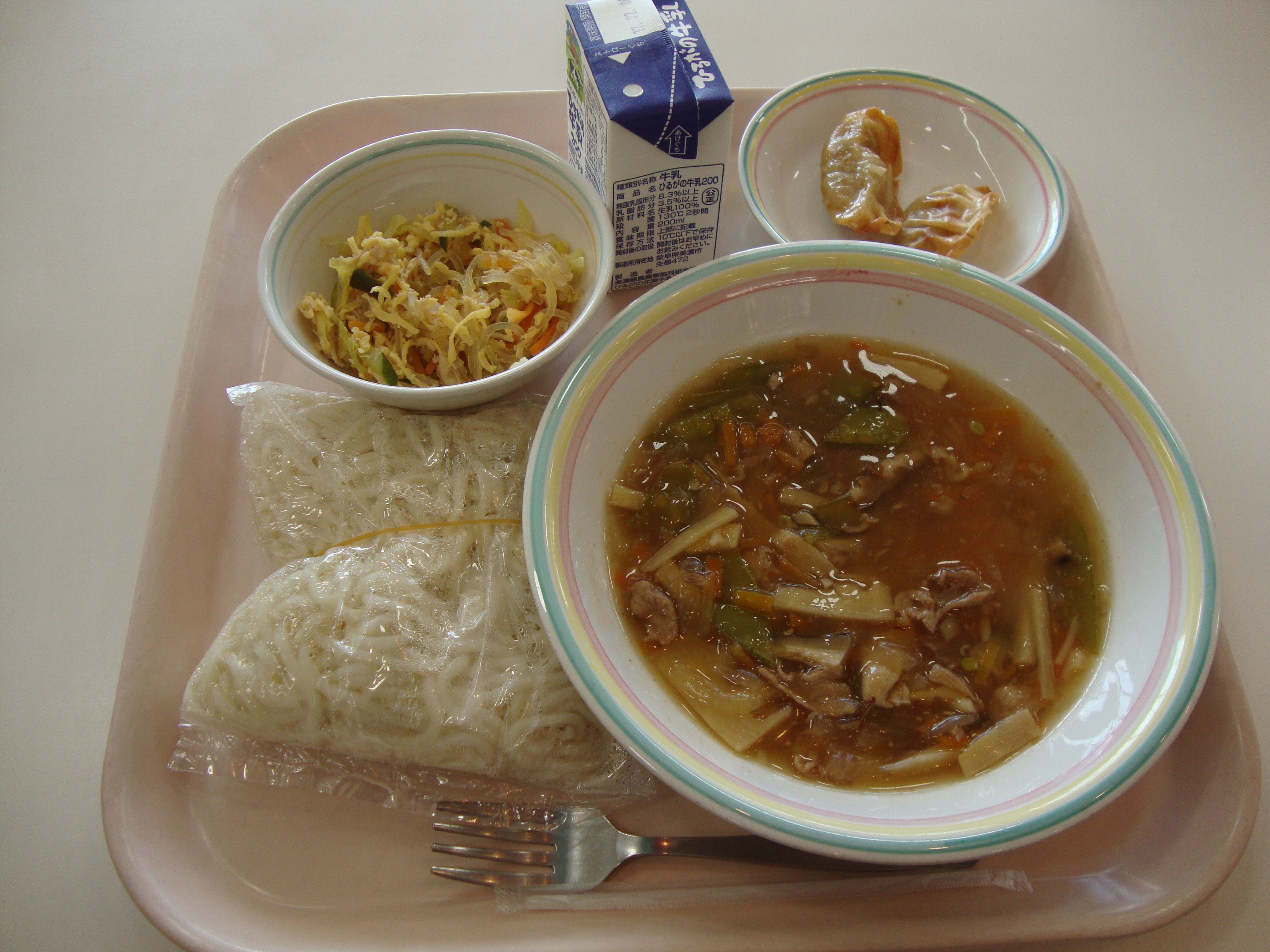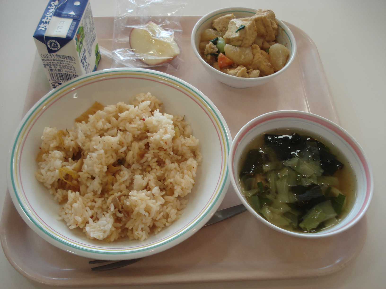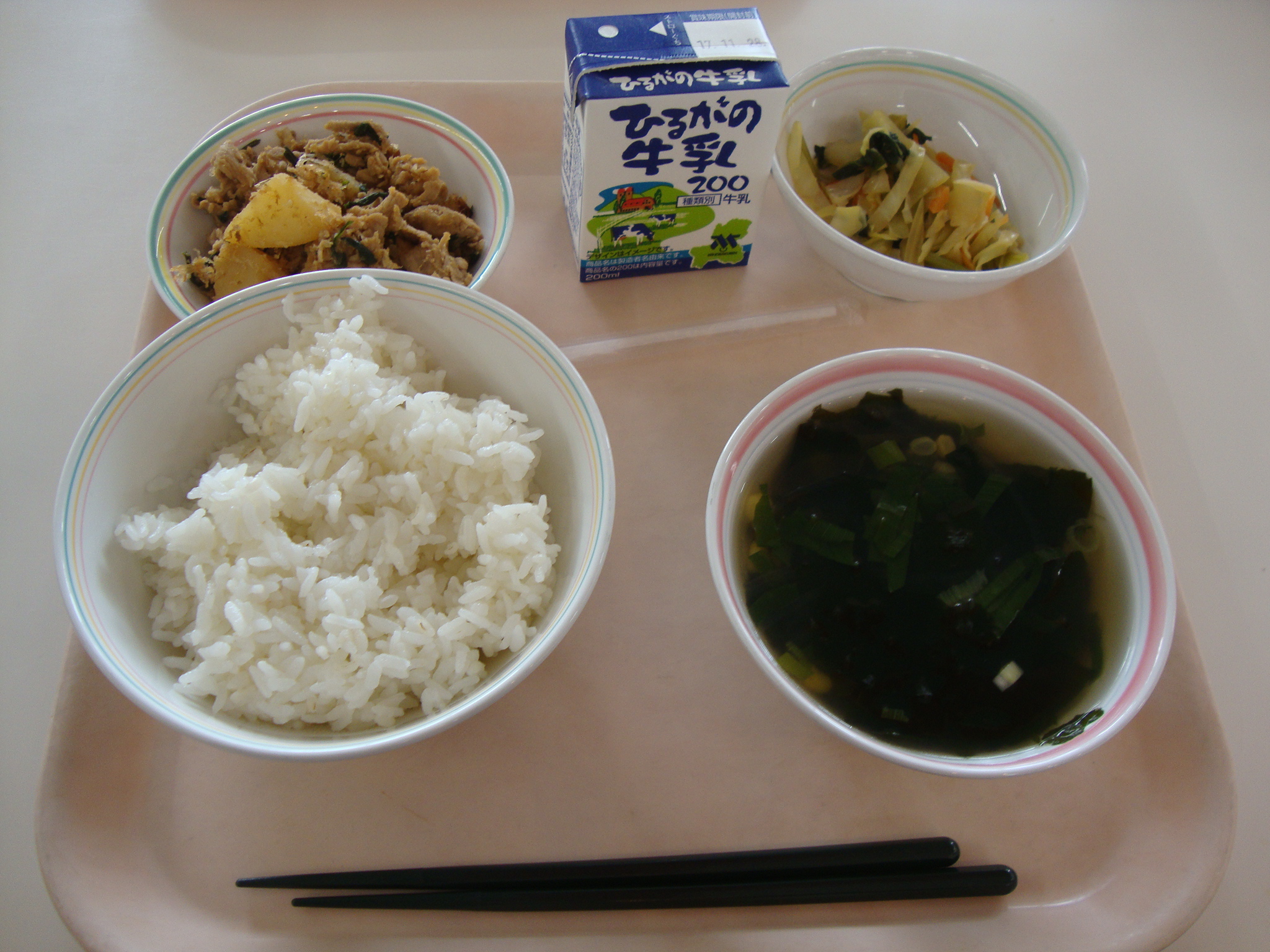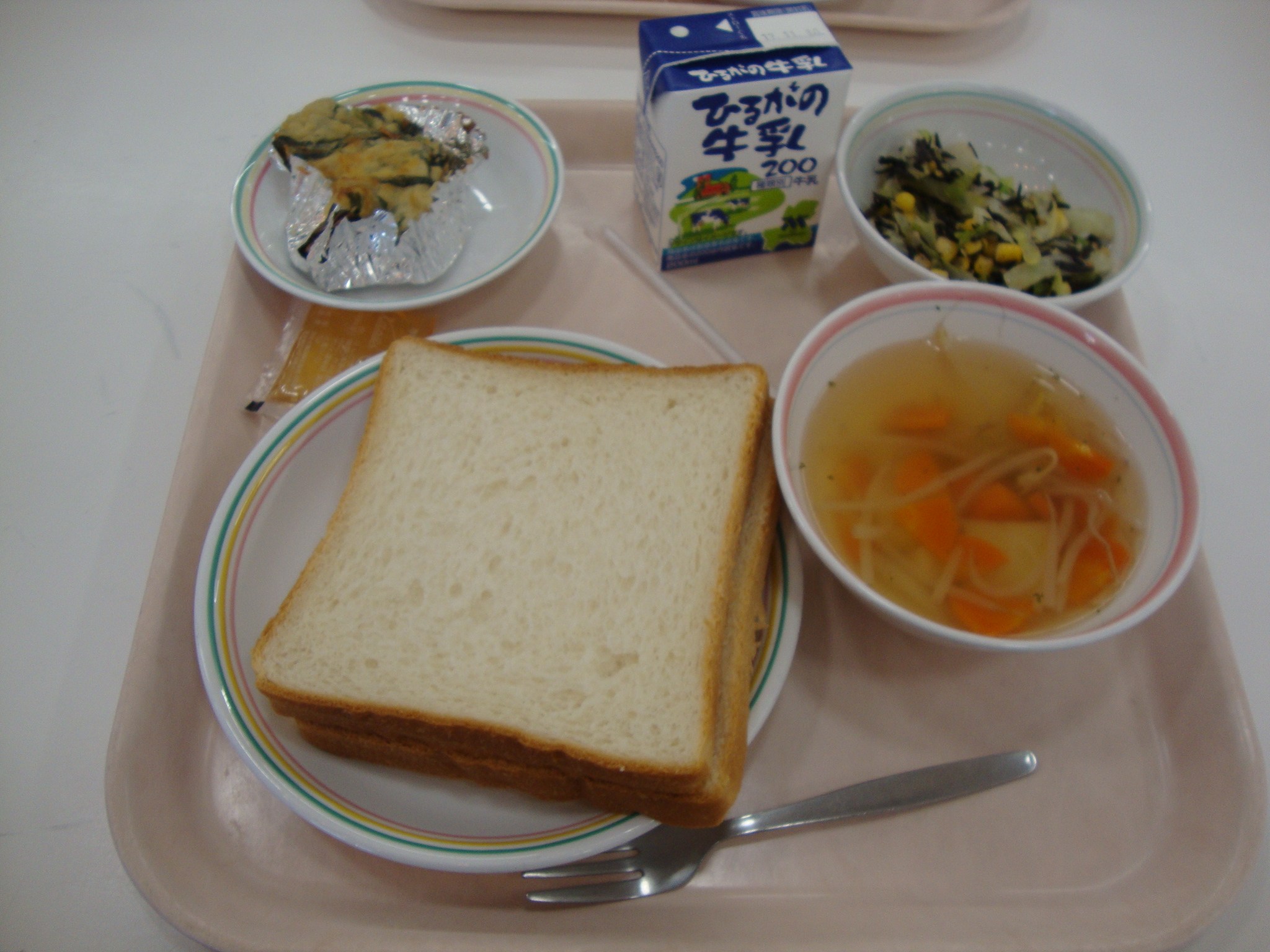 ごぼうは、外国で食べることは ほとんどありません。昔、日本で外国の人にごぼうの料理を出したところ、「木の根っこを食べさせた。」と言って問題になったほどです。そのため、今日のような「ごぼうのソテー」は、外国には存在しない料理です。ごぼうには、体の中を掃除する食物繊維や、体に良い働きをするポリフェノールも含まれています。よくかんで、ごぼうのおいしさを味わってください。また、今日はオムライスです。ケチャップ味のチキンライスに卵のシートをのせました。オムライスは、外国の料理ではなく、日本の料理です。味わって食べてくださいね。