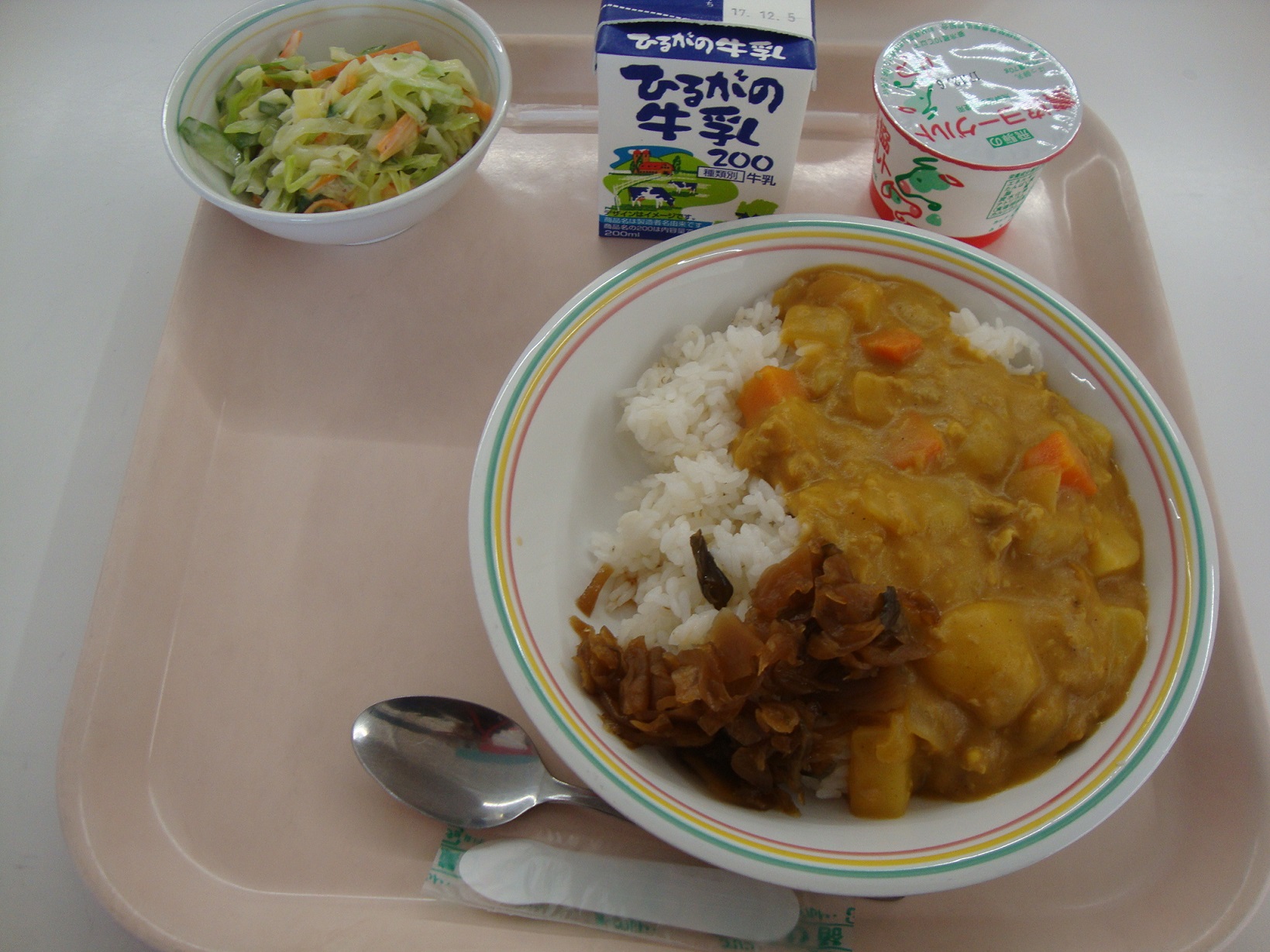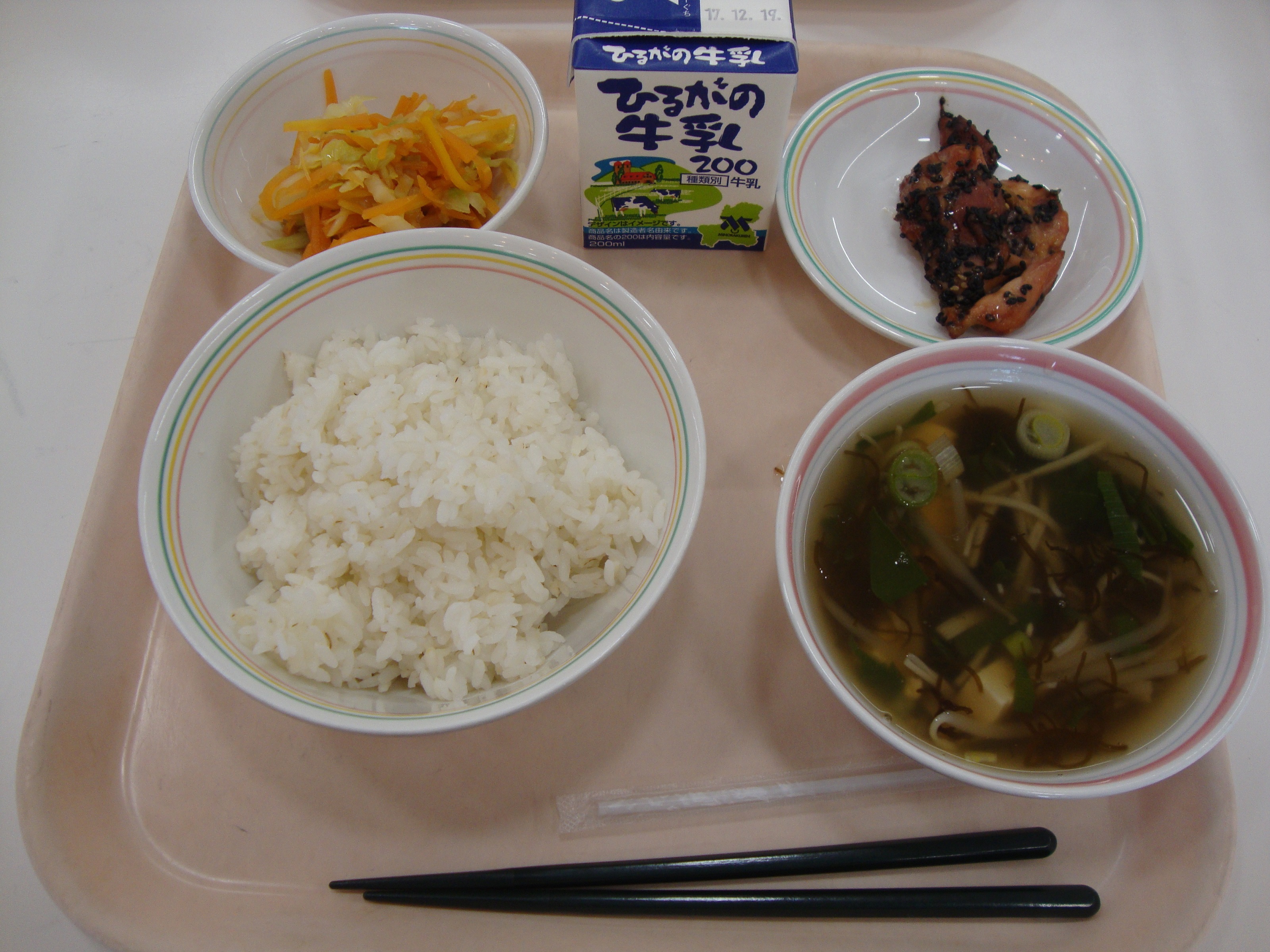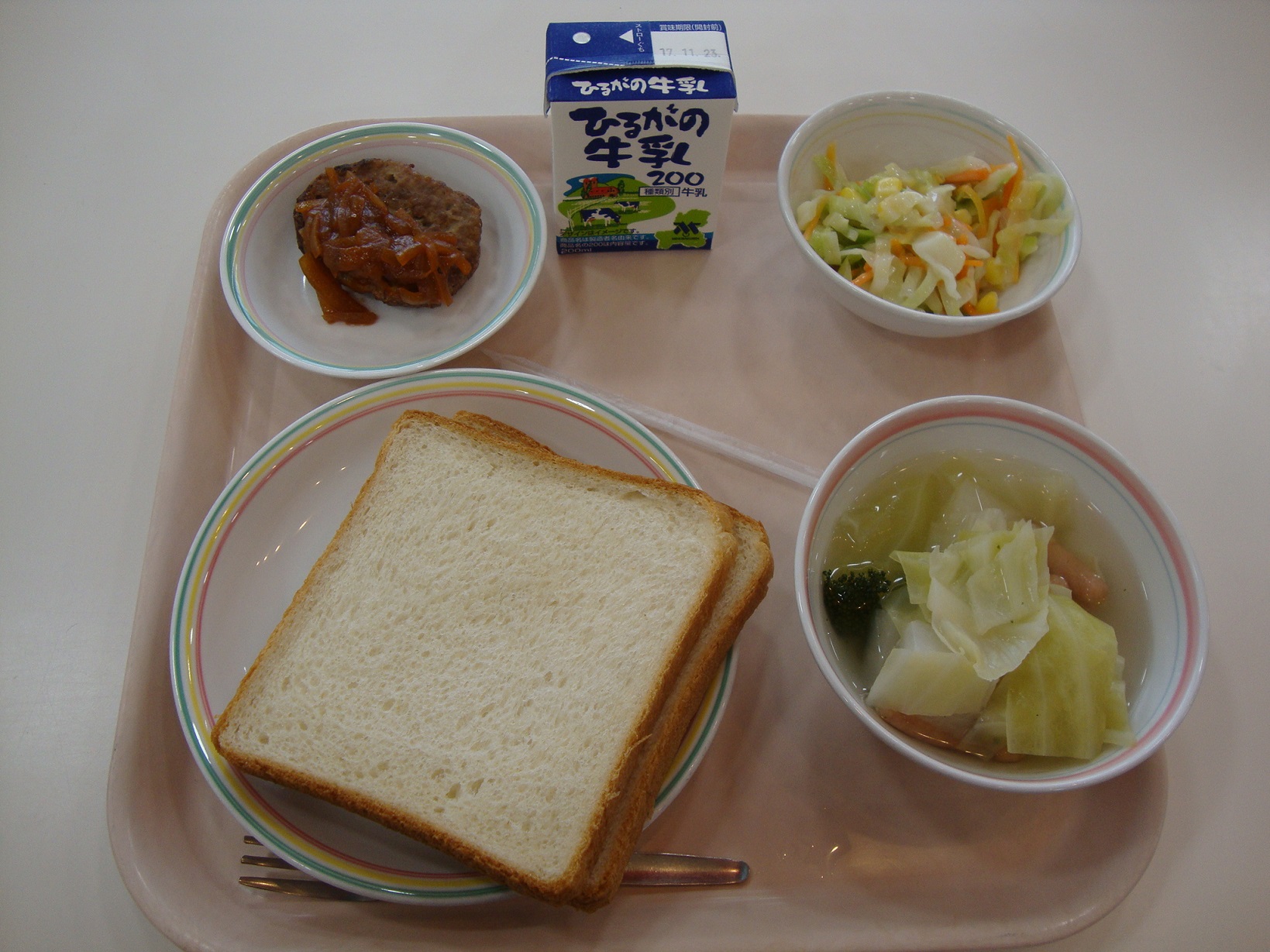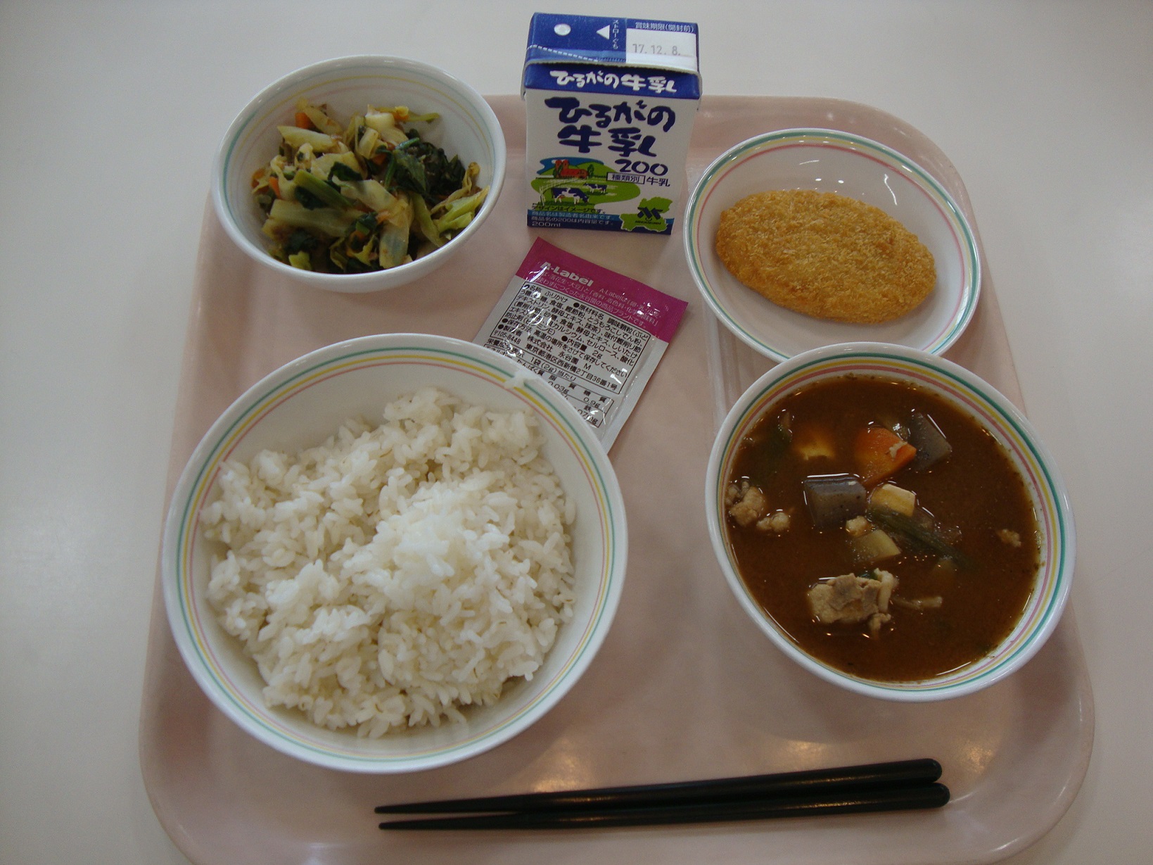ごぼうは、外国で食べることは ほとんどありません。昔、日本で外国の人にごぼうの料理を出したところ、「木の根っこを食べさせた。」と言って問題になったほどです。そのため、今日のような「ごぼうのソテー」は、外国には存在しない料理です。ごぼうには、体の中を掃除する食物繊維や、体に良い働きをするポリフェノールも含まれています。よくかんで、ごぼうのおいしさを味わってください。また、今日はオムライスです。ケチャップ味のチキンライスに卵のシートをのせました。オムライスは、外国の料理ではなく、日本の料理です。味わって食べてくださいね。