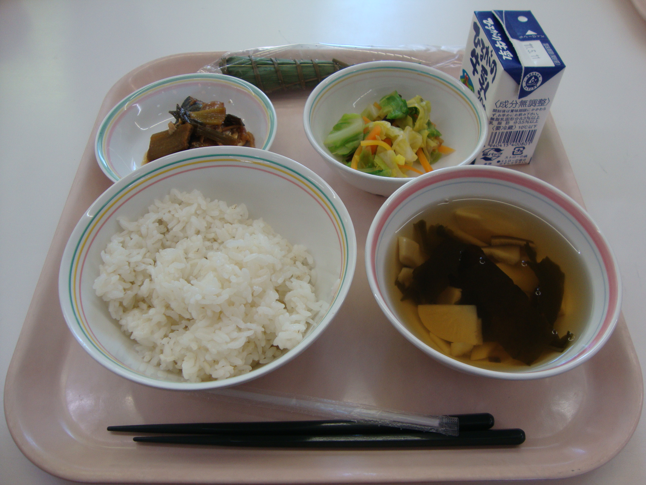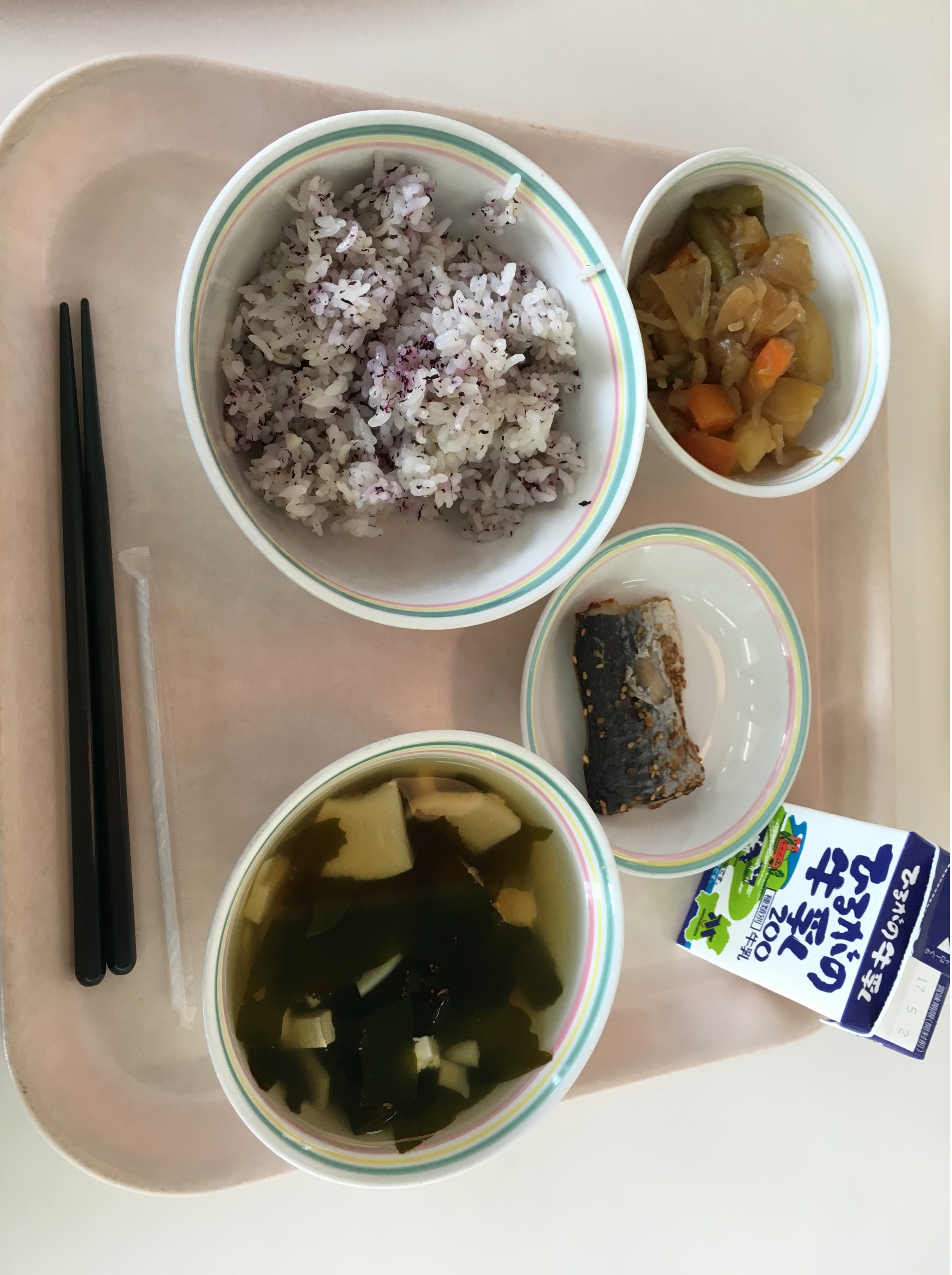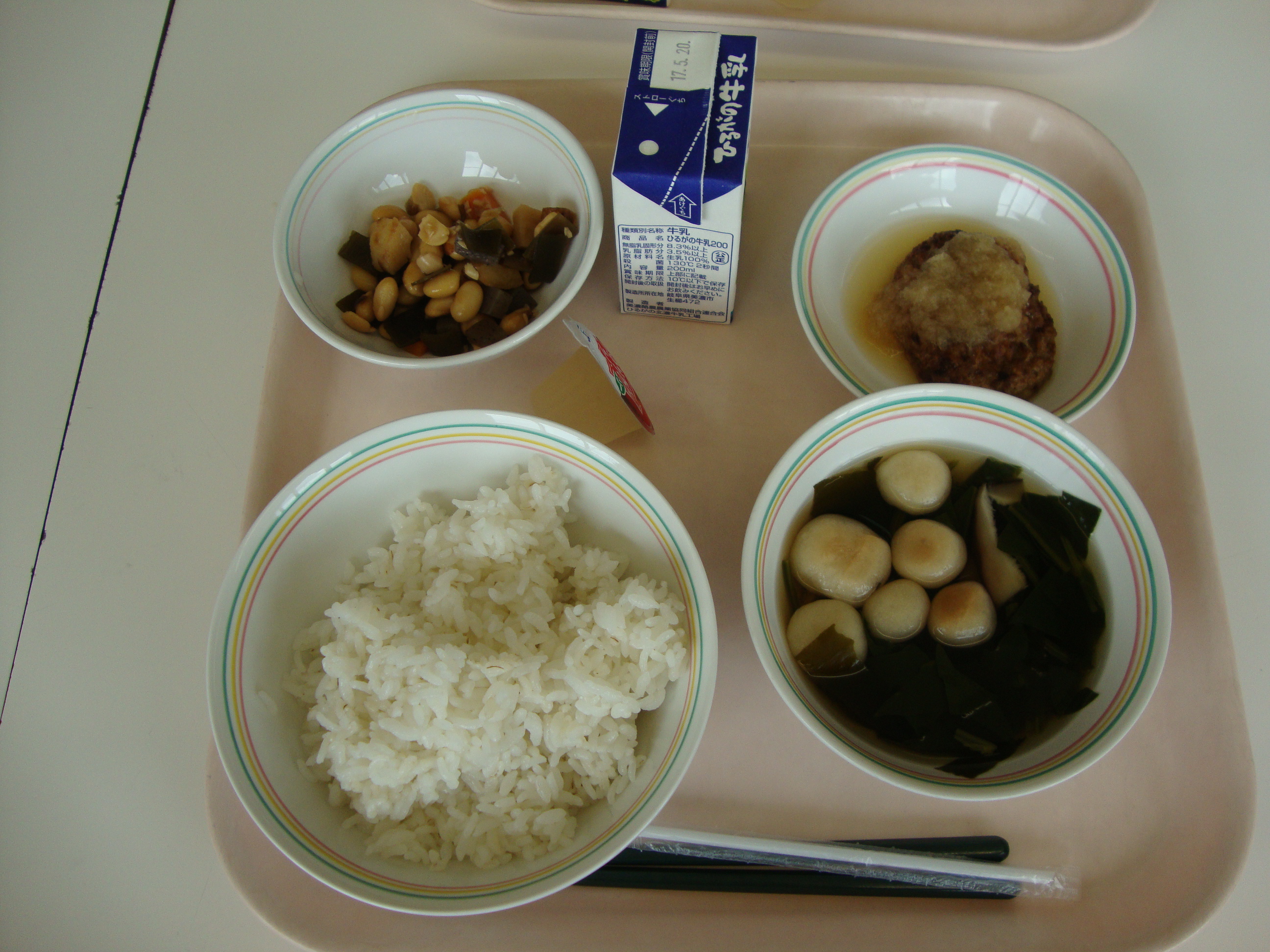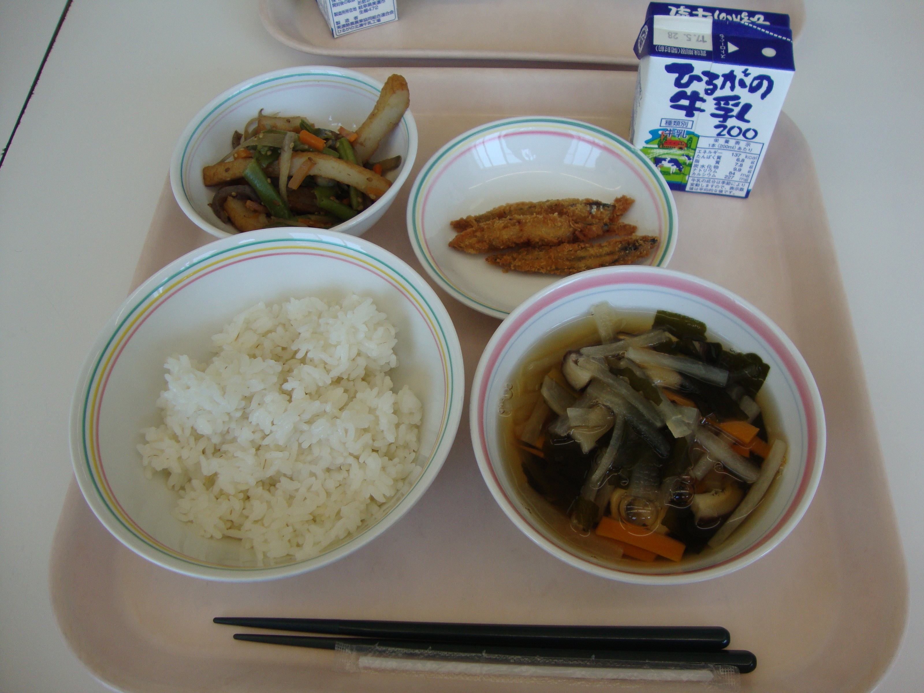 今日の味噌汁には、新玉ねぎ、人参、わかめ、ねぎが入っています。みなさんのおうちでは、味噌汁のだしは何を使っていますか。煮干しやかつおなど色々あると思いますが、学校では、仕上げに煮干を粉にしたものをつかっています。最後に加えることで、香りよく仕上げることができます。煮干の粉は溶けないので、ざらざらした感じが残りますが、カルシウムもとれる優れものです。お碗の底に沈みやすいので、よく混ぜて煮干し粉も一緒に飲むようにしましょう。