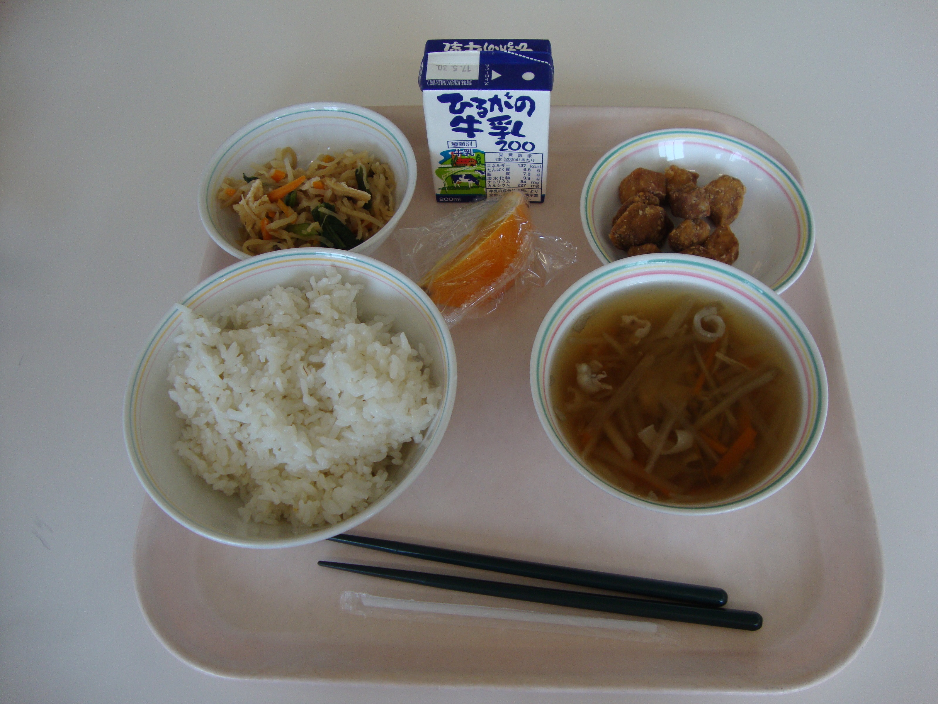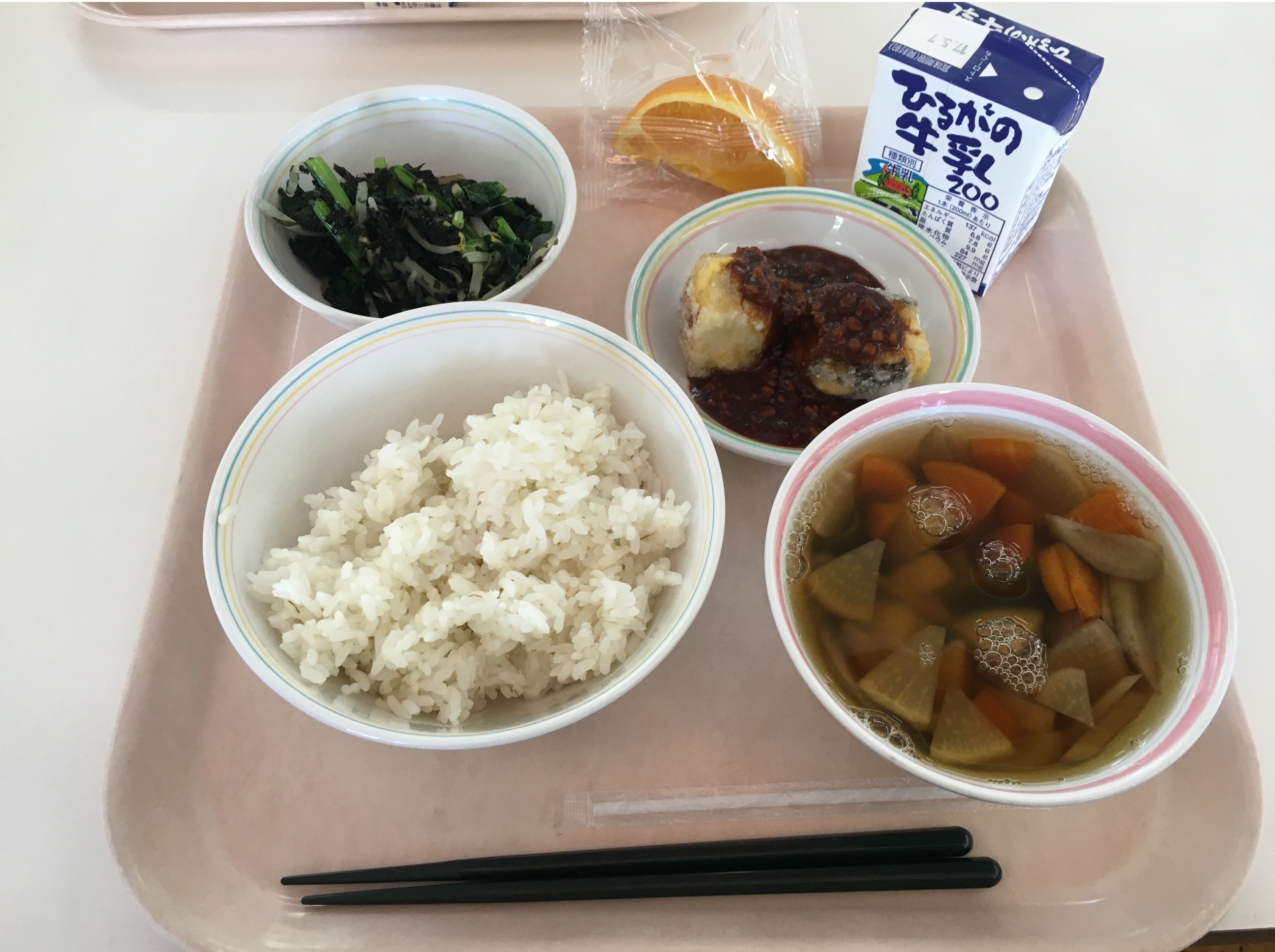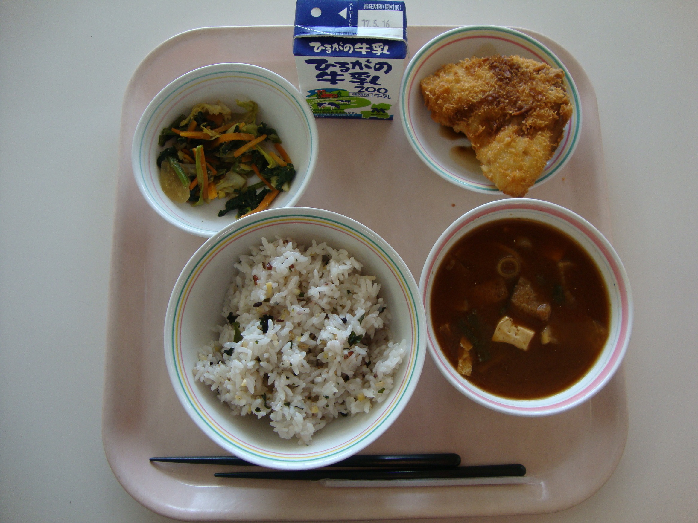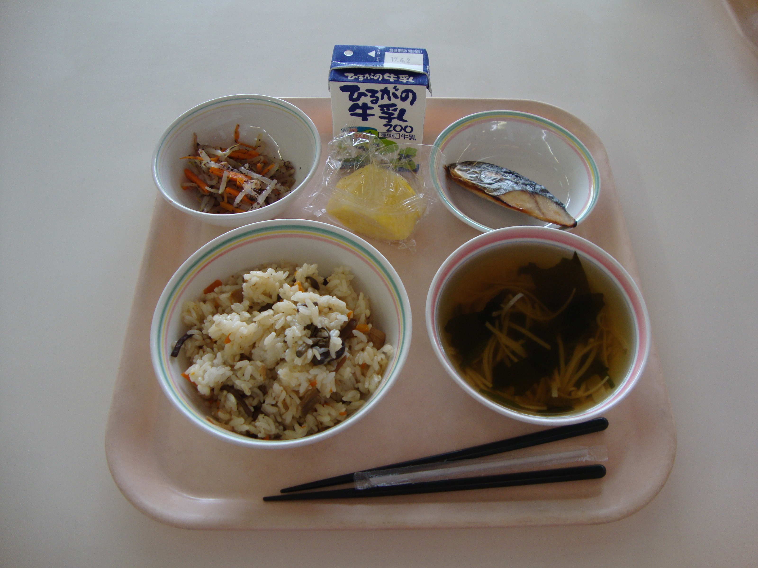 今日の味噌汁には、新玉ねぎ、人参、わかめ、ねぎが入っています。みなさんのおうちでは、味噌汁のだしは何を使っていますか。煮干しやかつおなど色々あると思いますが、学校では、仕上げに煮干を粉にしたものをつかっています。最後に加えることで、香りよく仕上げることができます。煮干の粉は溶けないので、ざらざらした感じが残りますが、カルシウムもとれる優れものです。お碗の底に沈みやすいので、よく混ぜて煮干し粉も一緒に飲むようにしましょう。