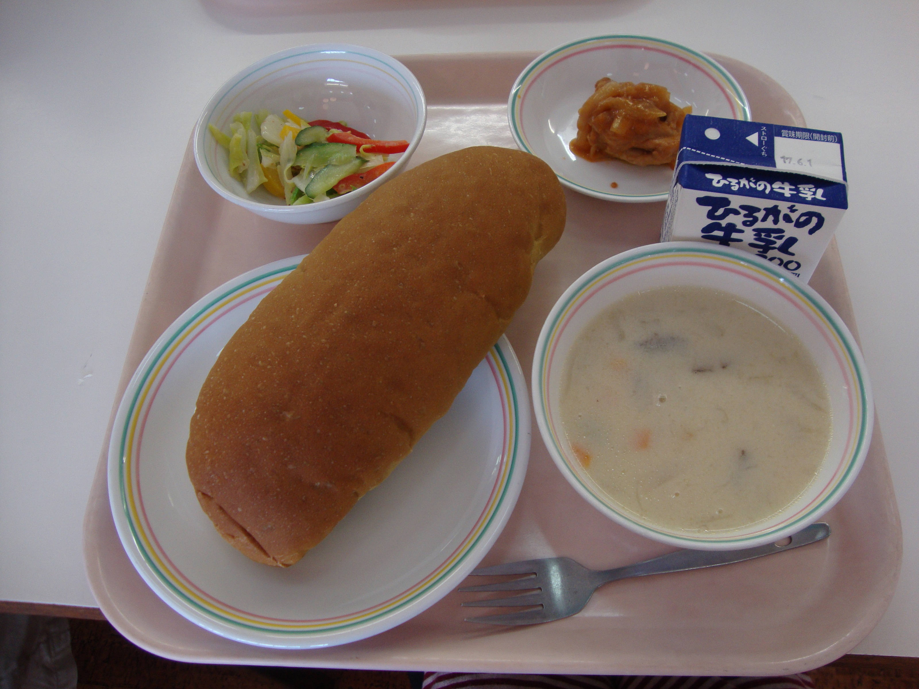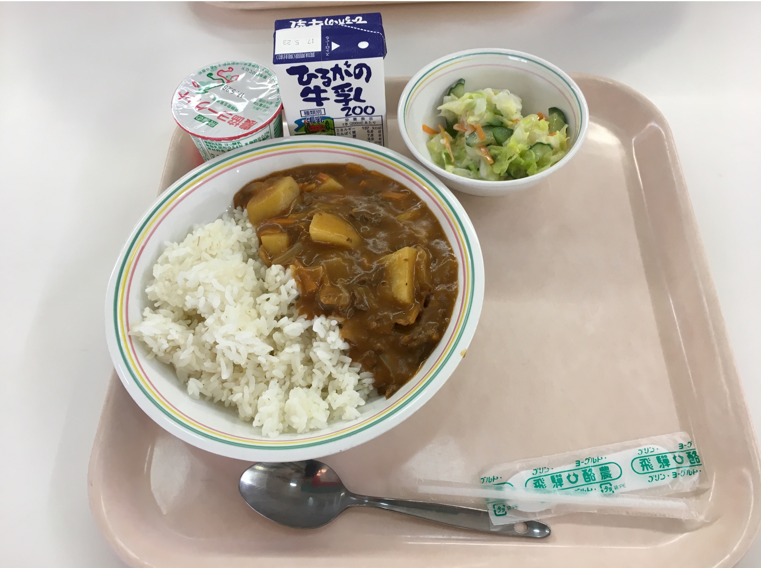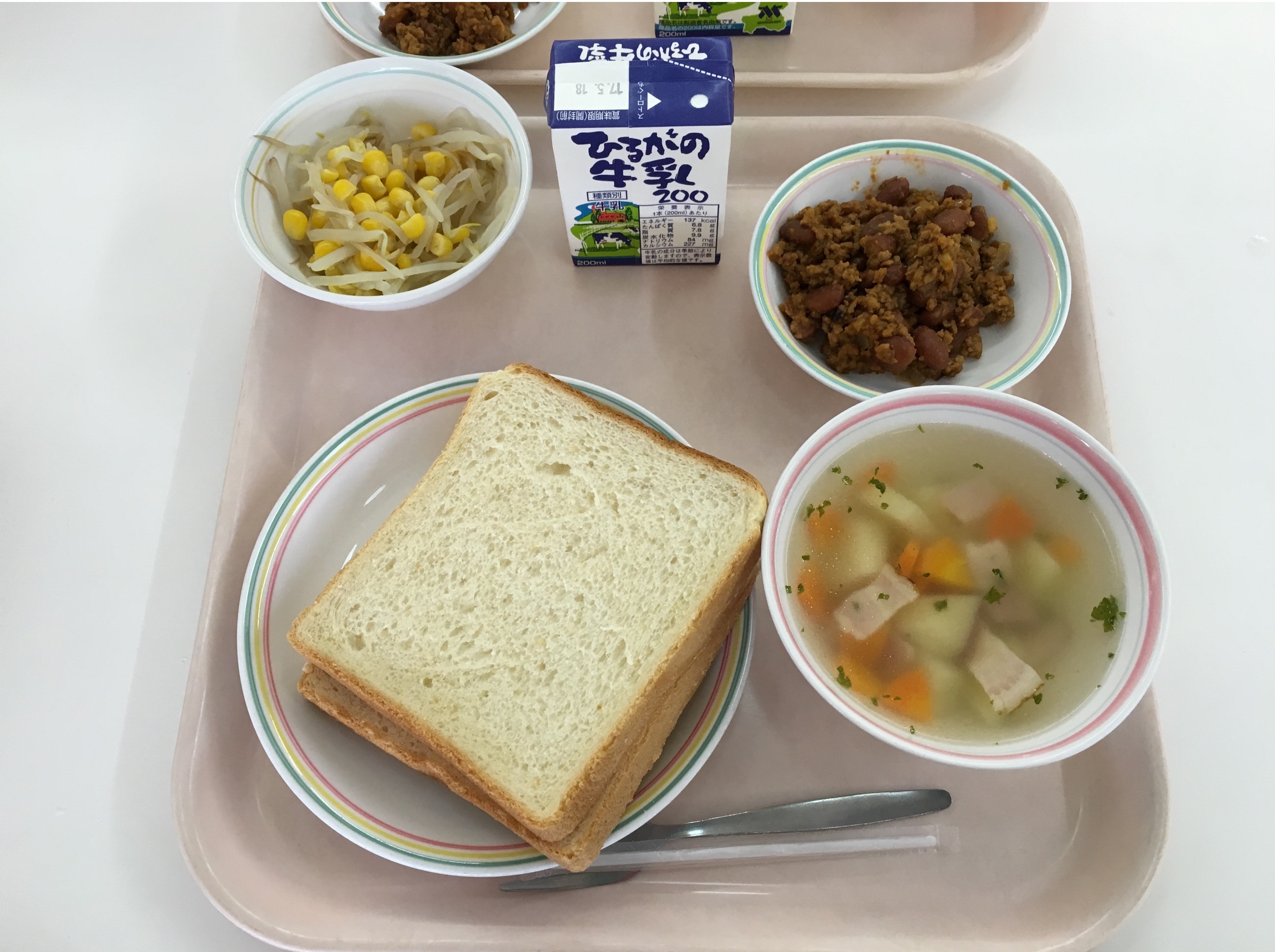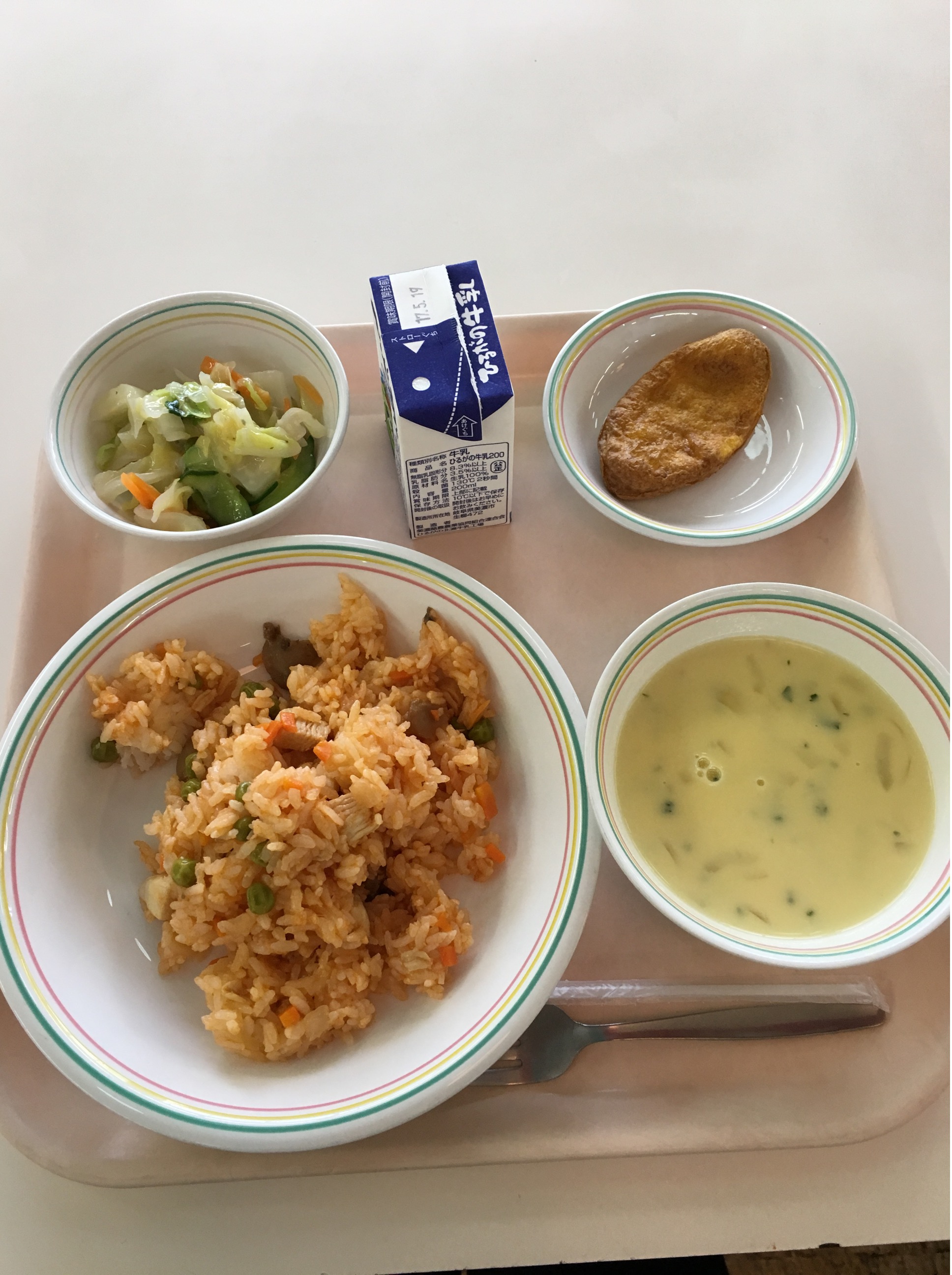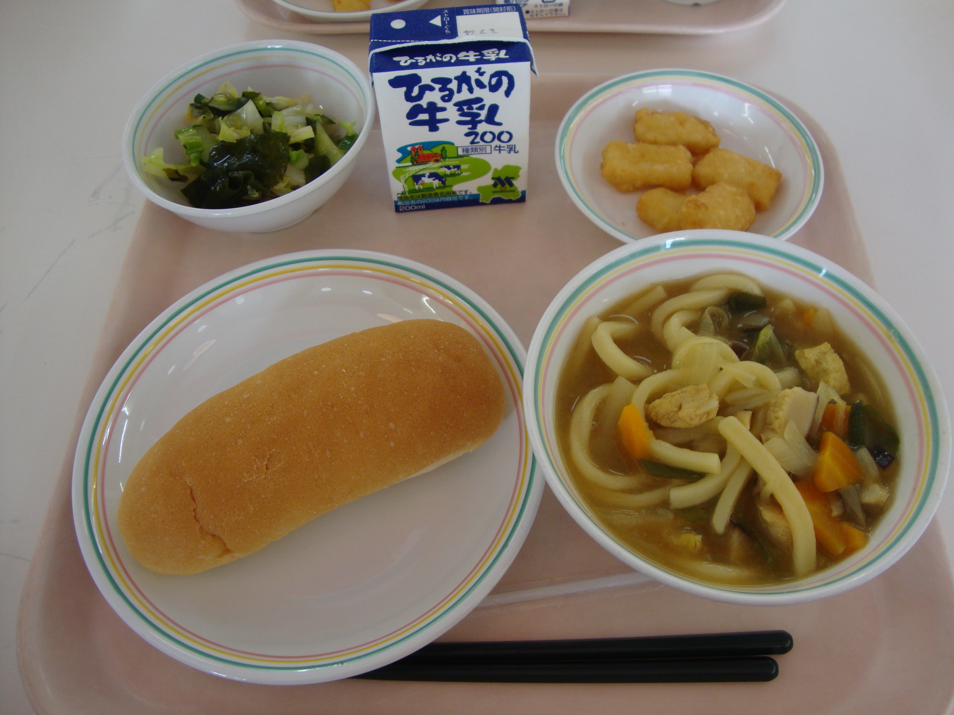 今日の味噌汁には、新玉ねぎ、人参、わかめ、ねぎが入っています。みなさんのおうちでは、味噌汁のだしは何を使っていますか。煮干しやかつおなど色々あると思いますが、学校では、仕上げに煮干を粉にしたものをつかっています。最後に加えることで、香りよく仕上げることができます。煮干の粉は溶けないので、ざらざらした感じが残りますが、カルシウムもとれる優れものです。お碗の底に沈みやすいので、よく混ぜて煮干し粉も一緒に飲むようにしましょう。