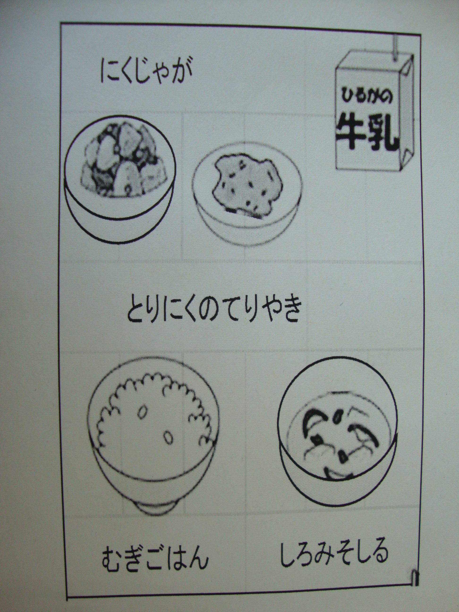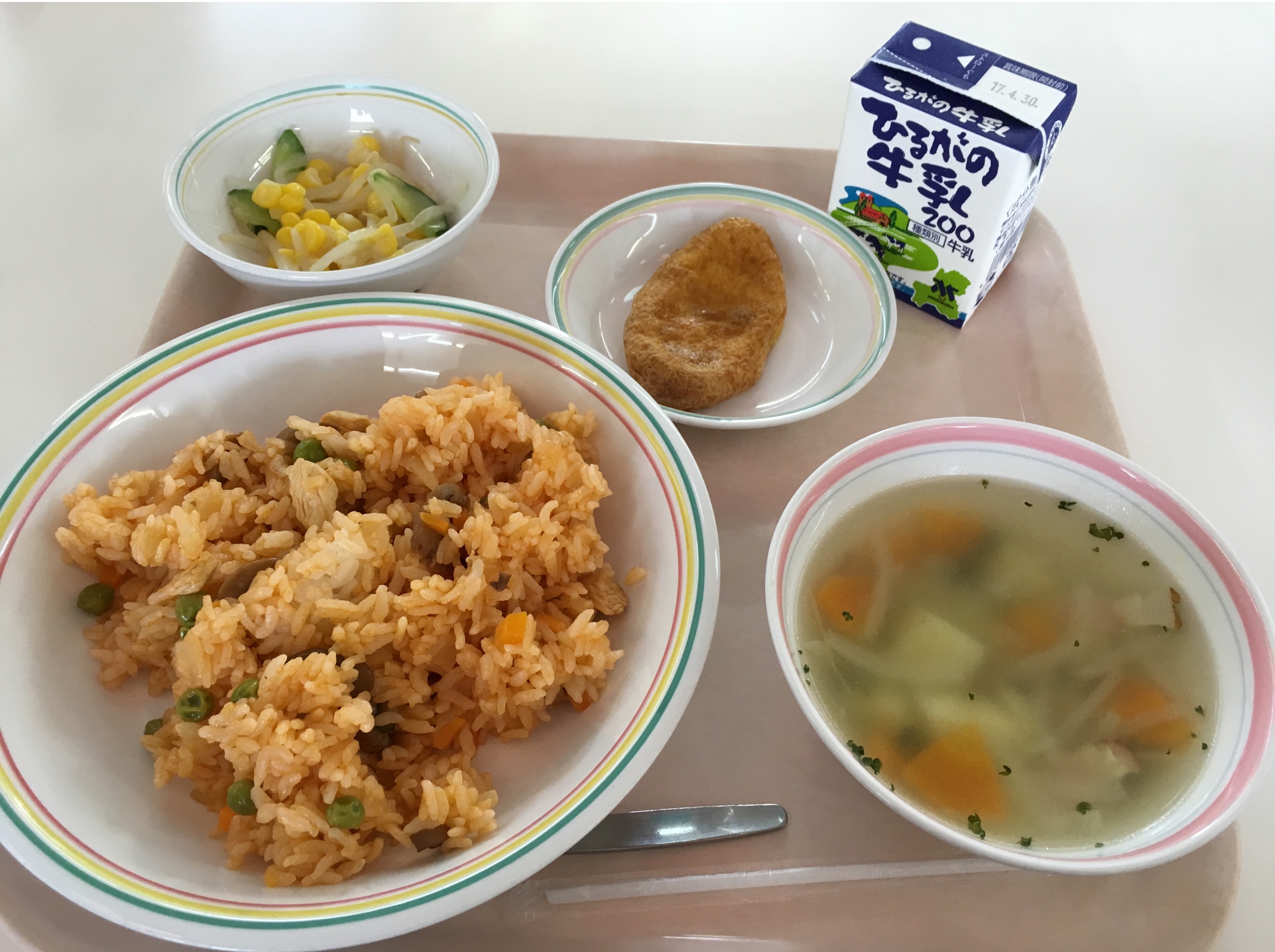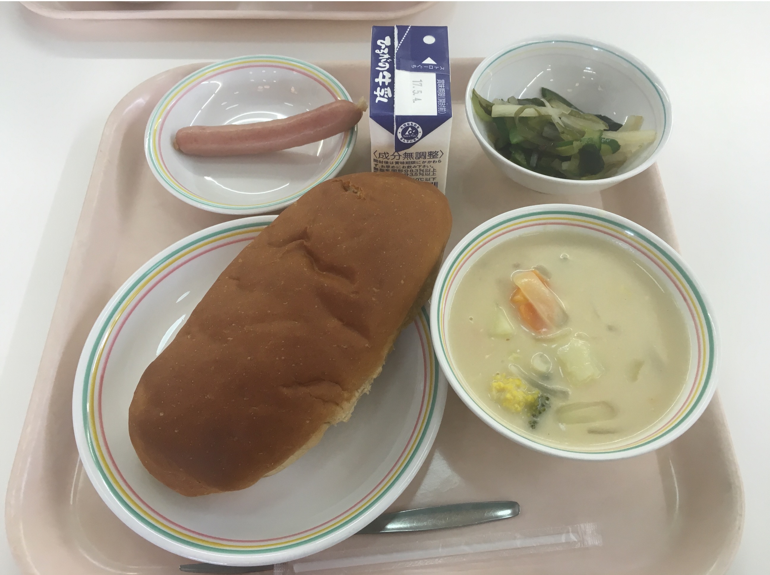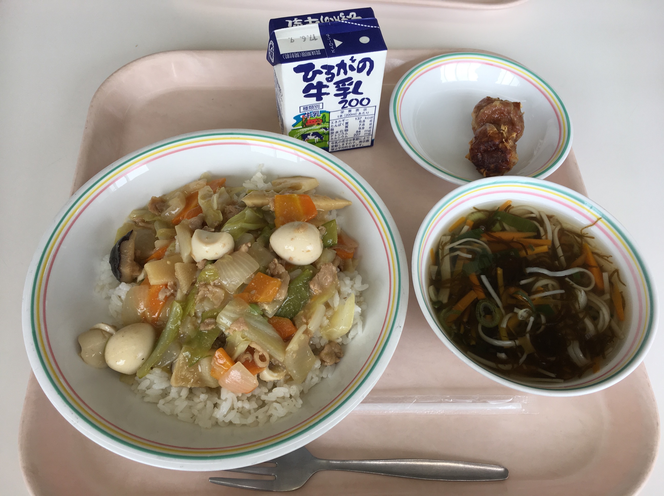今日の味噌汁には、新玉ねぎ、人参、わかめ、ねぎが入っています。みなさんのおうちでは、味噌汁のだしは何を使っていますか。煮干しやかつおなど色々あると思いますが、学校では、仕上げに煮干を粉にしたものをつかっています。最後に加えることで、香りよく仕上げることができます。煮干の粉は溶けないので、ざらざらした感じが残りますが、カルシウムもとれる優れものです。お碗の底に沈みやすいので、よく混ぜて煮干し粉も一緒に飲むようにしましょう。
