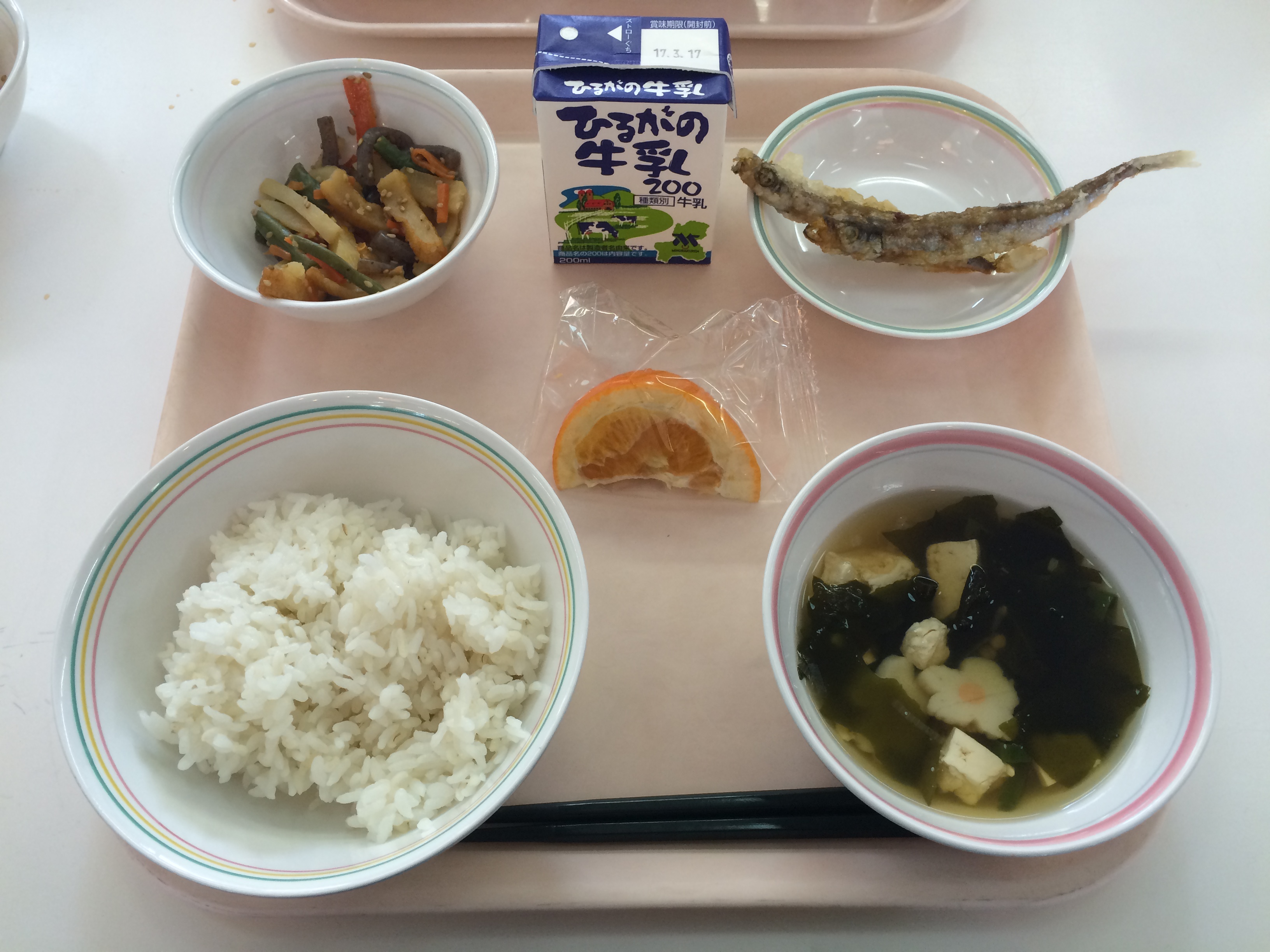 今日のししゃもは、片栗粉をつけて油で揚げ、砂糖・しょうゆ、みりん、お酒を合わせた、たれをかけました。みなさんの中には、ししゃもが苦手な人が多いですね。みなさんが苦手なものでも、その食べ物の良さを分かってほしいと願い、できるだけ食べやすいように考えて作っています。油で揚げ、たれの味をつけることで、食べやすくなったでしょうか?感想を聞かせてくださいね。