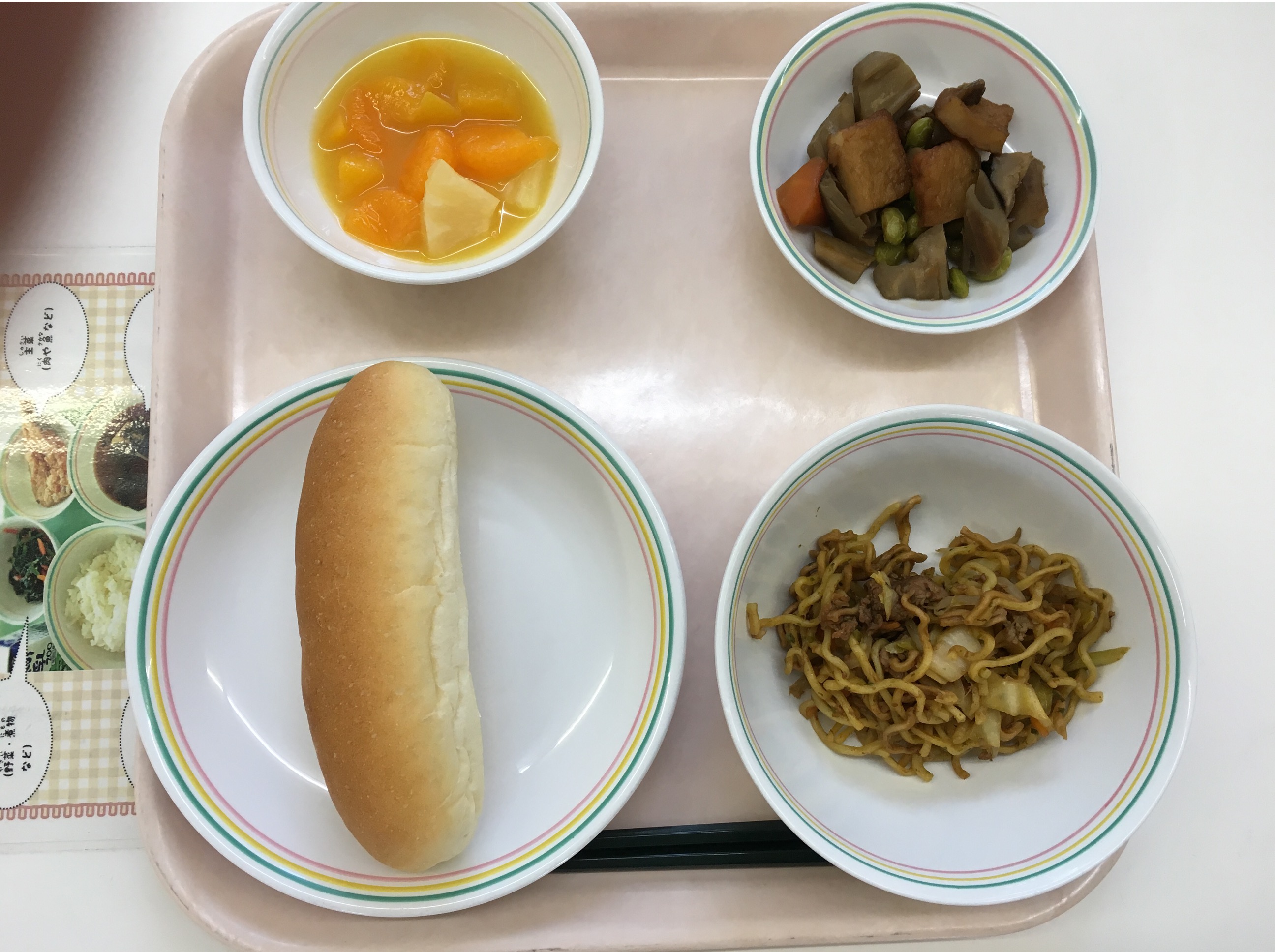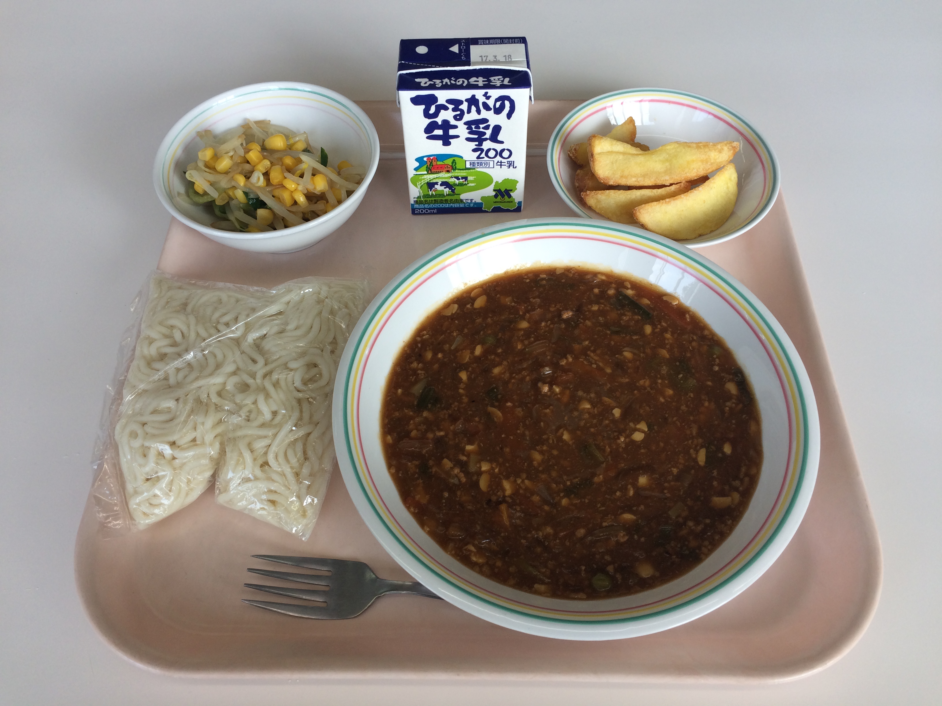中力粉は、岐阜県でとれた小麦粉を使っています。ソフト麺は学校給食用に考えられたものです。山県市では毎月1回登場しますが、地域によってはソフト麺が学校給食では登場しない、というところもあるそうです。今日は、肉みそのソースです。麺とソースをよく混ぜて食べてくださいね。