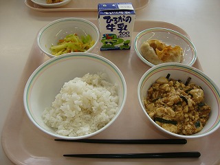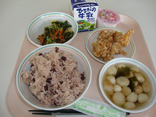 昔から日本では、お祝いに小豆を入れて炊いた赤飯を食べる習慣があります。今日は、いつものお米に、もち米を混ぜて炊いて、もちもち感を出しています。赤飯は苦手な人がいるようですが、お祝いの食事です。また、お祝いデザートとして、豆乳ホイップ付きの苺ゼリーもあります。時間内にデザートまで食べられるように、時間を気にしながら食べてくださいね。