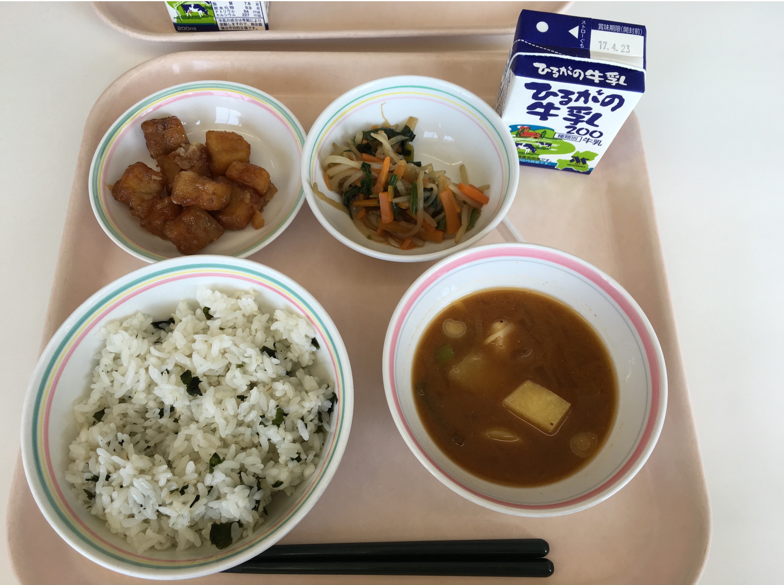 入学、進級でまだ緊張している人も多いと思います。そんなみなさんが食べやすいように、今日は人気メニュー「カレーライス」の給食です。