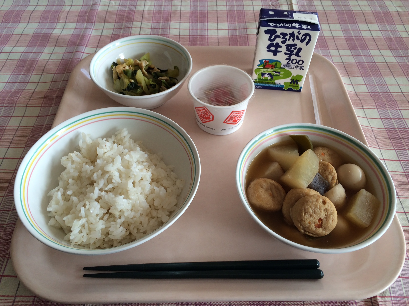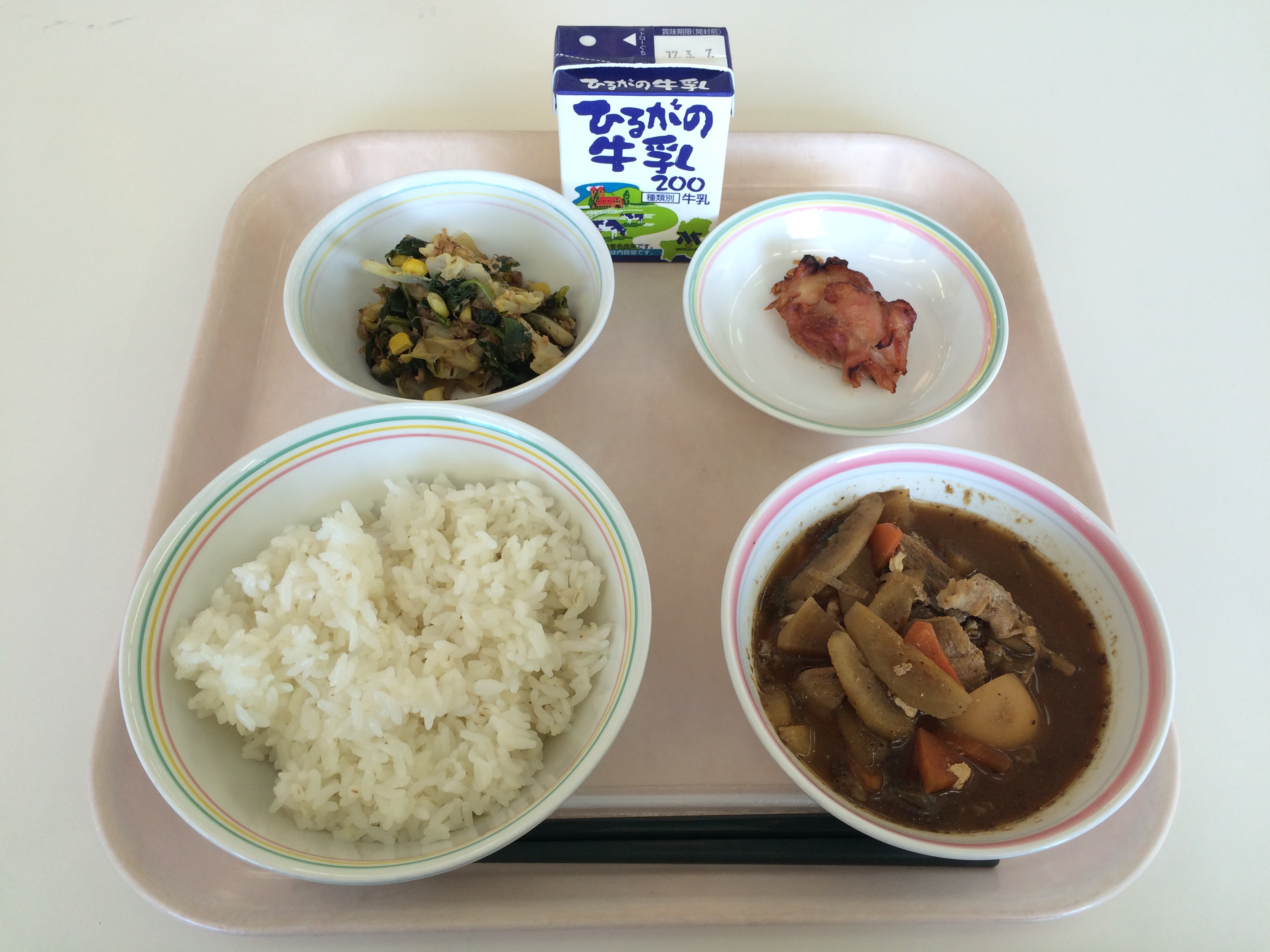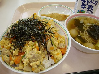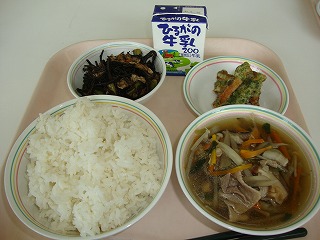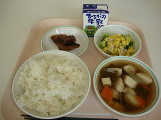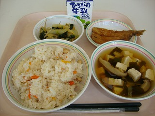 今日の給食では、魔よけに使われるいわしと、大豆をごはんに入れました。しっかり食べて病気に負けない元気な体を作りましょう。