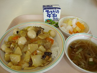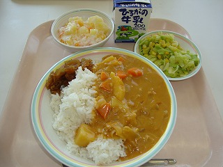 家でもカレーライスを食べますか?お家で作る時には、カレールウを入れて仕上げることが多いでしょうね。給食では、カレールウは手作りで作ります。釜や鍋などにマーガリンを入れて弱火にかけて溶かします。そこへ小麦粉をざるに入れて、ふるいにかけながら入れます。ゆっくりかき混ぜていくと、だんだん色がついてきます。焦がさないように気を付けながら煎っていくと、茶色くなって香ばしいにおいが漂ってきたら、最後にカレー粉を入れて火を止めます。豚肉、たまねぎ、にんじん、じゃがいもを煮込んで味付けした中へ、手作りのカレールウを入れてじっくりと煮込んでいきます。すぐ火を止めるのではなく、よーく煮込むことで、とろみのある、おいしいカレーができあがります。今日のカレーライスはおいしくできたでしょうか?感想を聞かせてくださいね。