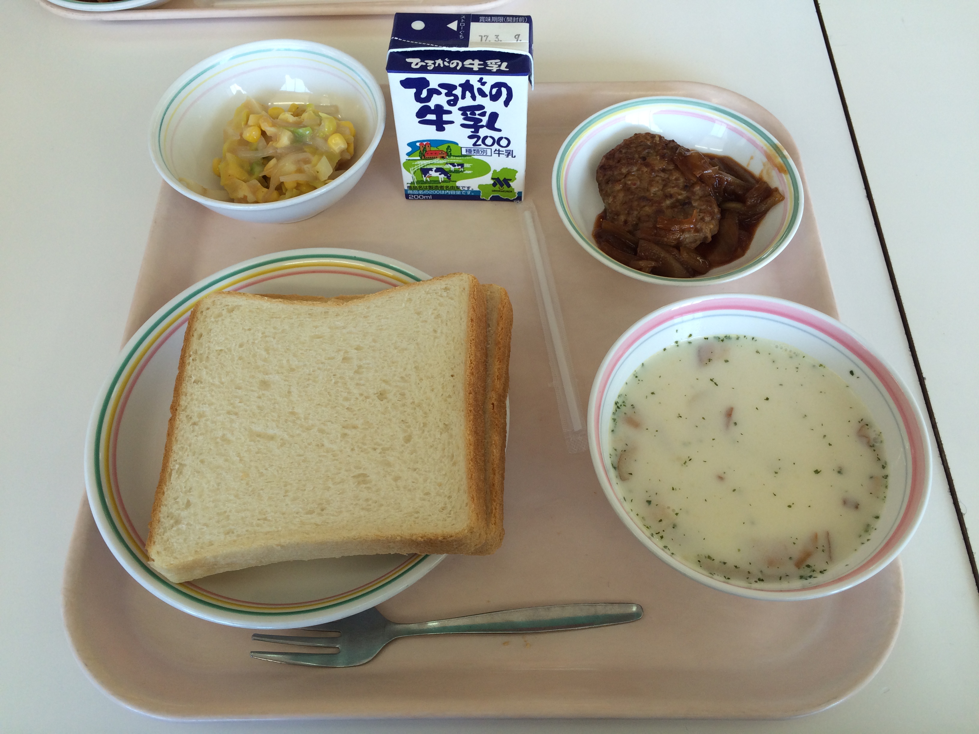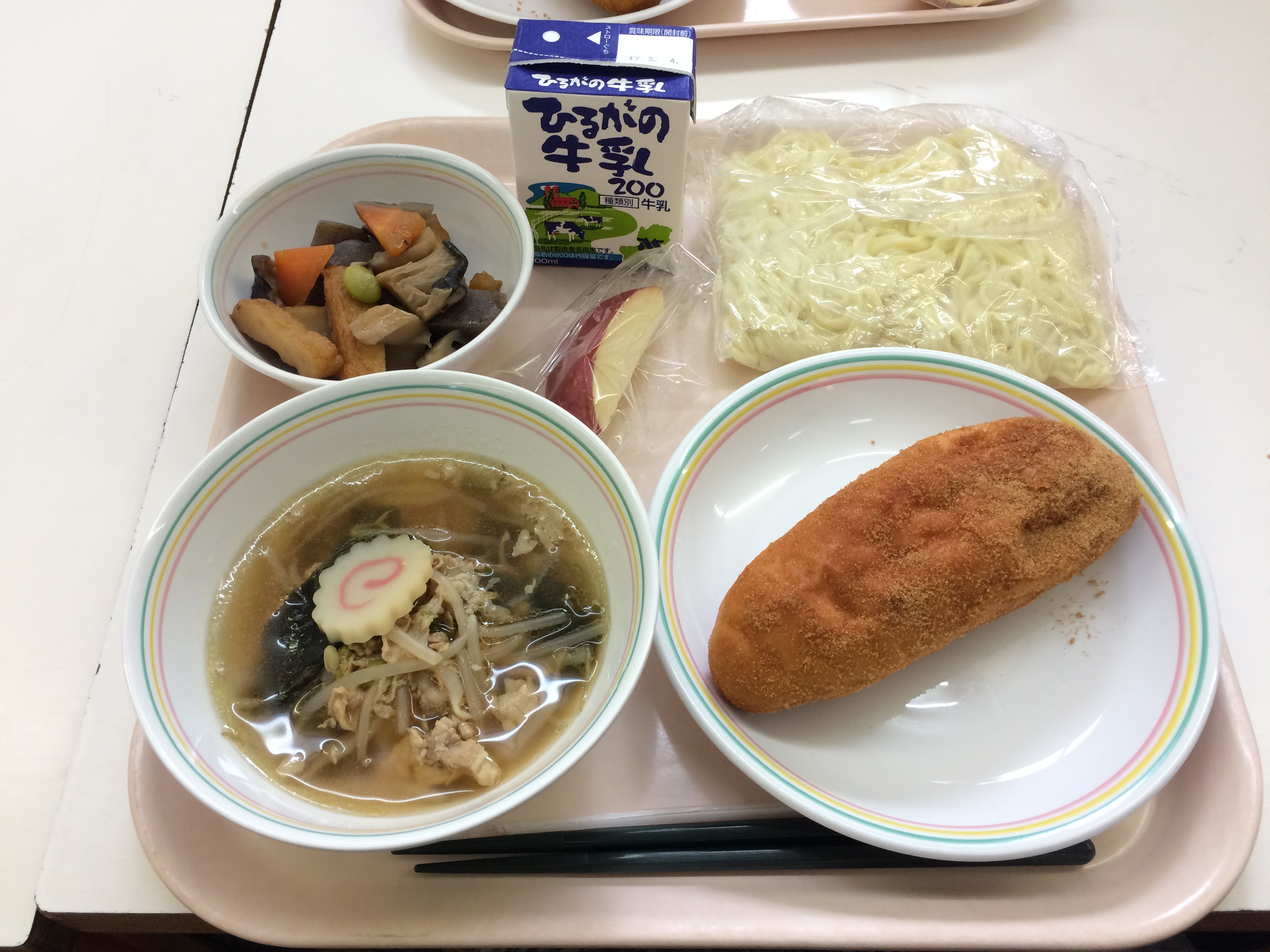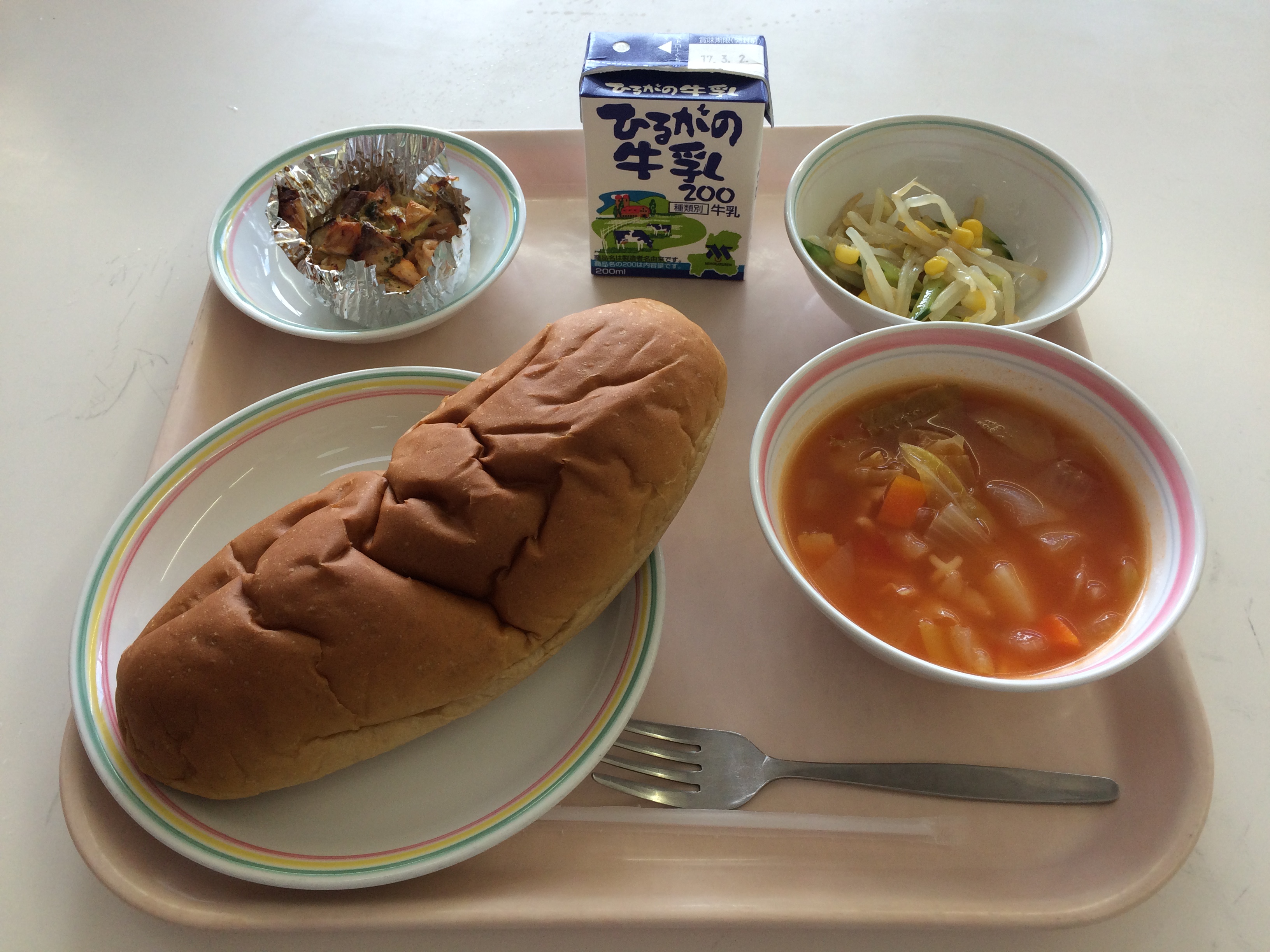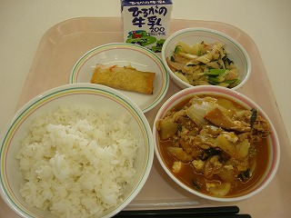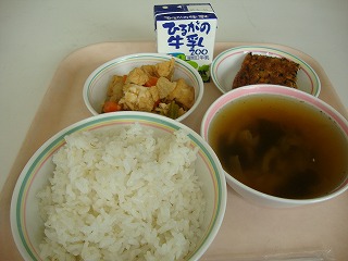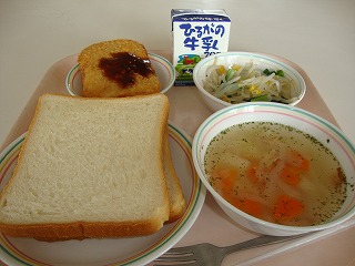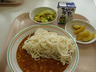 ミートソースには、豚のひき肉と、くだいた大豆が入っています。みなさんは肉は好きですか?肉をある程度食べることは体をつくるもとになるので大切なのですが、食べすぎは良くありません。肉ばかりを食べ続けると、体の中にも悪い影響を及ぼし、腸の中は老化していき、便秘になります。しかし、極端に肉を食べないのもよくないのだそうです。肉を食べなさ過ぎる人も便秘になりやすくなります。つまり、食べすぎも、食べなさ過ぎもよくありません。バランスよく何でも食べることが大切です。今日も残さず食べてくださいね。