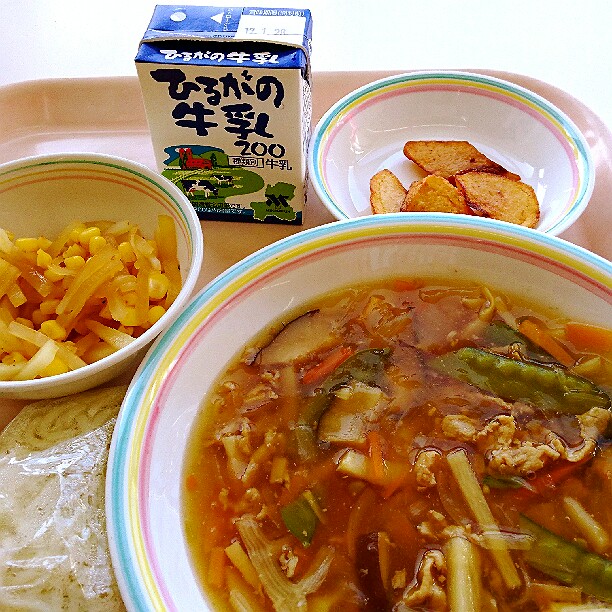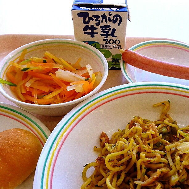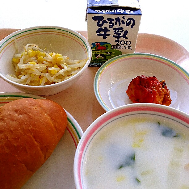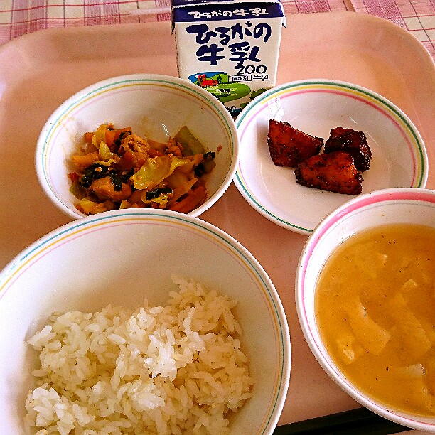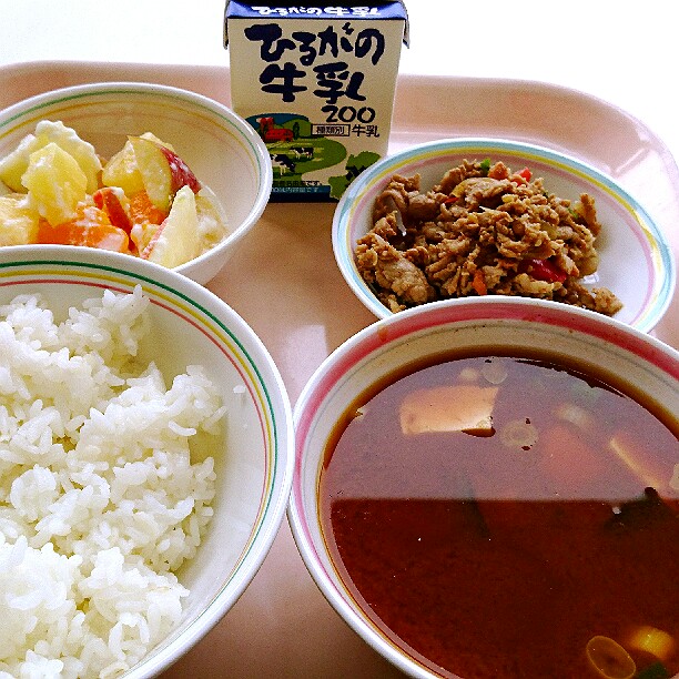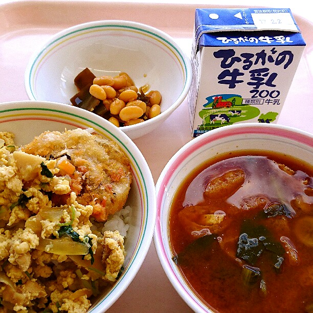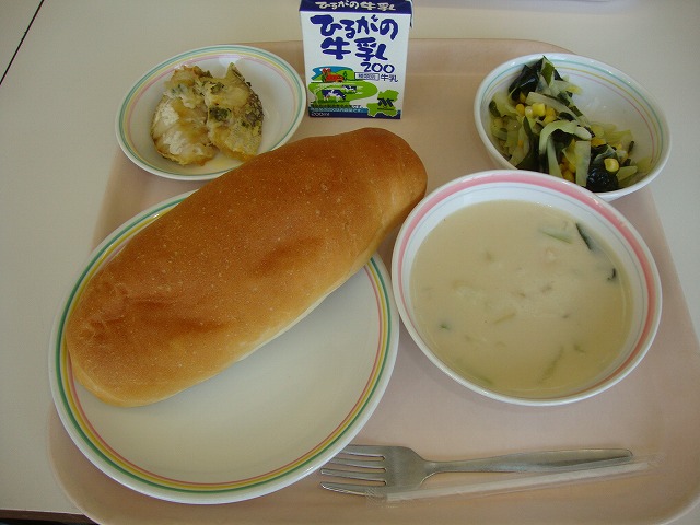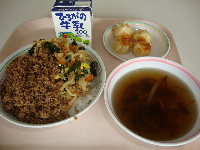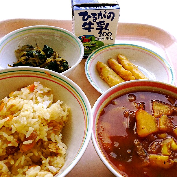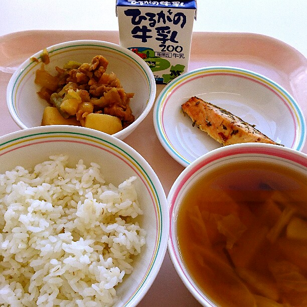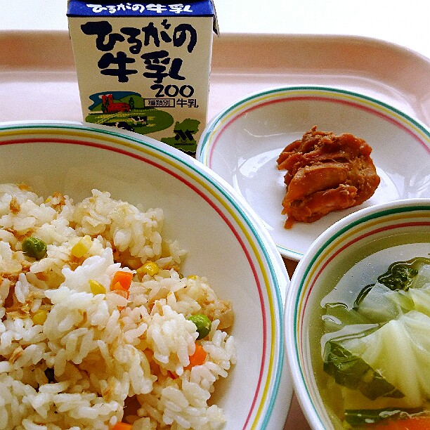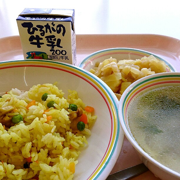 今日は、ピラフについてのお話です。ピラフとは、もともとはトルコ語で、「炒めた米と様々な具材を出汁で炊いた料理」という意味です。トルコでは、メインの肉や魚料理に添えられるおかずとして食べられていましたが、トルコからフランスへこの料理が伝わり、主食として食べるようになりました。給食のピラフは、具材や出汁と一緒に炊くことができないので、マーガリンで米を炒めてから、いつもよりも固めにご飯を炊き、釜で具を作って、炊きあがったご飯と具材を混ぜています。今日は、マグロの水煮をたくさん使った「ツナピラフ風の洋風混ぜごはん」です。味わって食べましょう。