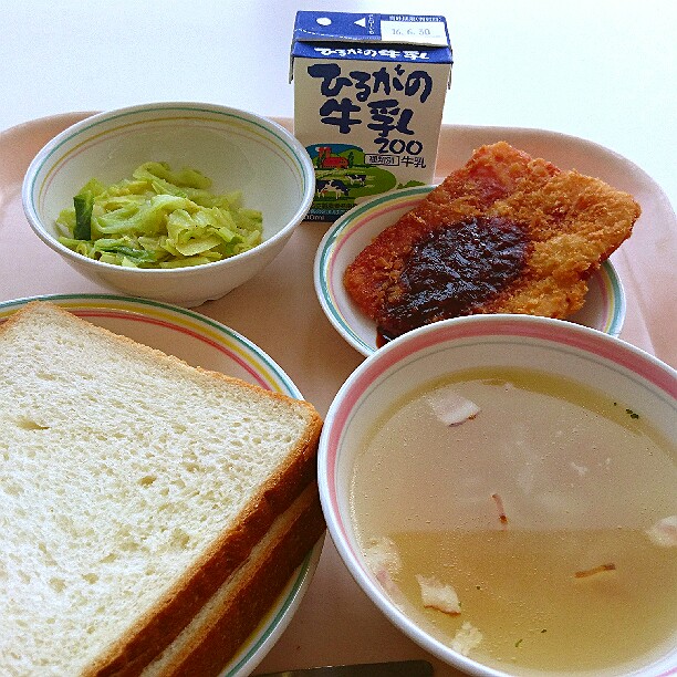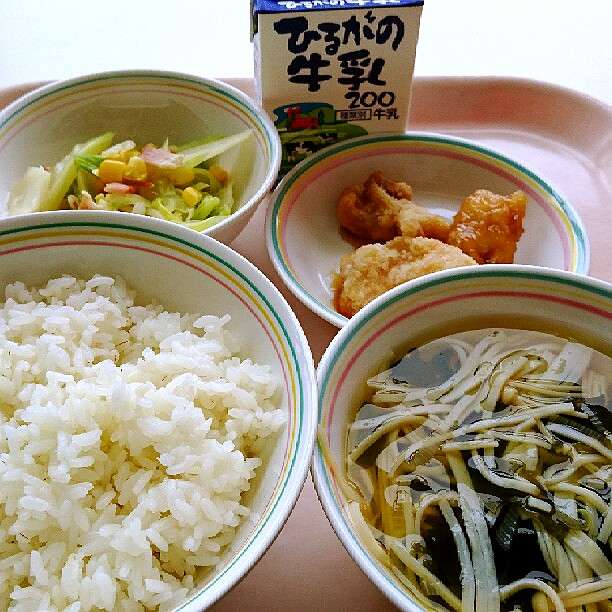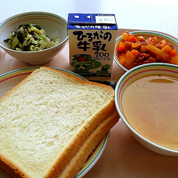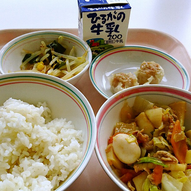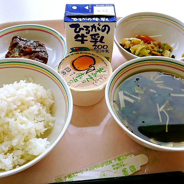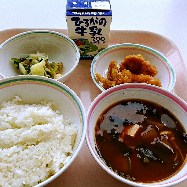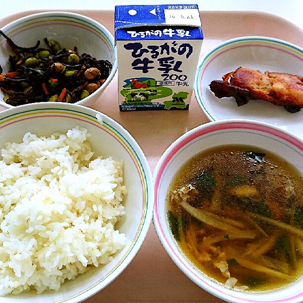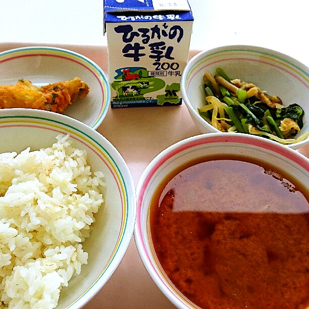 ごはんの「なめし」に入っている大根葉にはカルシウムが多く含まれています。ひじきの炒め煮のひじきにもカルシウムたっぷりです。かみなり汁の豆腐にもカルシウムが含まれます。もちろん毎日つく牛乳にもカルシウムがたっぷりです。