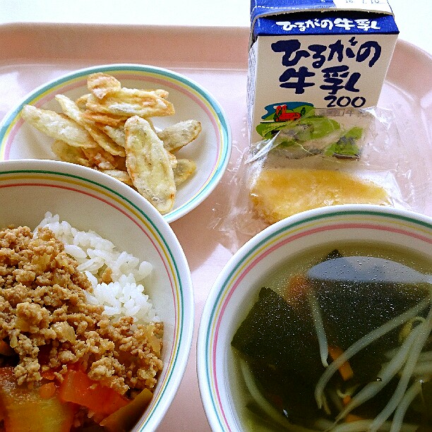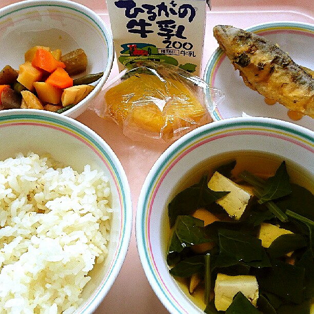 あじは、5月~7月の、ちょうど今頃が旬の魚です。あじは「ぜいご」といって、かたいトゲのようなウロコが横にあるのが特徴です。食べやすいように、この「ぜいご」は取ってあります。丸ごとのあじを見かけたら、「ぜいご」があるかどうかみてくださいね。今日は、油で揚げた後、たまねぎ、ピーマン、砂糖、酢、しょうゆ、一味唐辛子のたれをかけました。暑くなるこの季節、酸味のある、さっぱりした たれが合いますね。一度に口の中に入れないで、少しずつよくかんで、骨がないことを確かめてから飲み込むようにしてください。ごはんと交互に食べて、ごはんだけ残った、ということのないように食べてください。また、今日のみそ汁には、生のさやえんどうが入っています。さやえんどうは、ひとつひとつ筋を取りました。調理員さんに感謝していただきましょう。