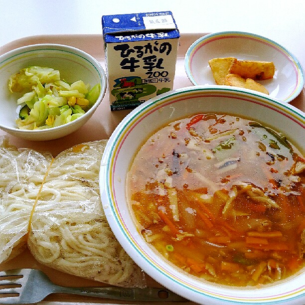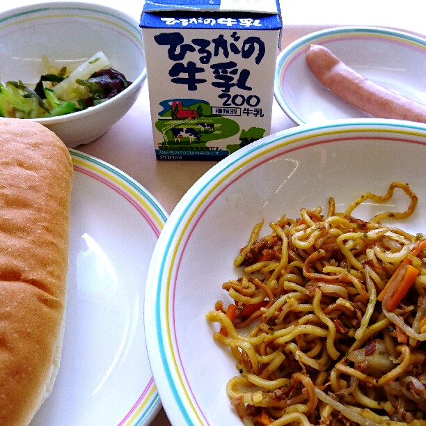 今日は、焼きそばについての話です。みなさんは、焼きそばを作ったことはありますか?みなさんが焼きそばを作る作り方と、給食の焼きそばの作り方が大きくちがうところがあります。それは一体どんな作り方なのでしょうか?答えは、給食では麵をやくことです。みなさんが家で作るときは、肉や野菜を炒め、その中に麵を入れて炒めていき、味をつけていく作り方ではないでしょうか?給食では、麵をオーブンで焼きます。なぜオーブンで焼くのかというと、家で作るように炒めても、なかなか火が通らないためです。麵の温度をしっかりと上げることで、ムラなく焦げつかずに作ることができます。このように、給食は家で作るのとは番う場合があります。今日の焼きそばはいかがですか?