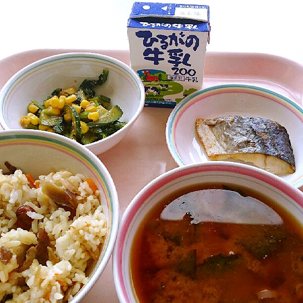 また、今日の味噌汁のなすは、3年生が社会の学習で見学に行ったてんこもりから納めてもらったものです。私たちの住む山県市でとれたなすです。このように地域でとれたものを地域で消費することを地産地消といいます。