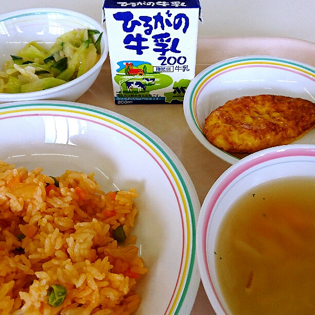 今日は、山県市の給食の新メニュー「タコライス」についての話です。みなさんは、タコライスがどの地域の料理か知っていますか?正解は沖縄県です。タコスというアメリカでよく食べられている料理の具をご飯にのせたものです。ひき肉や玉ねぎなどをスパイスで炒め、上からサルサソースという辛いトマトソースをかけるのが本場のタコライスですが、今日は給食用にアレンジして、辛さは控えてあります。蒸し暑くて食欲がなくなりやすいこの時期に、ごはんをしっかりと食べてほしいという思いから献立に採用されました。ごはんと具を混ぜながら残さず食べましょう。また感想を教えてくださいね。